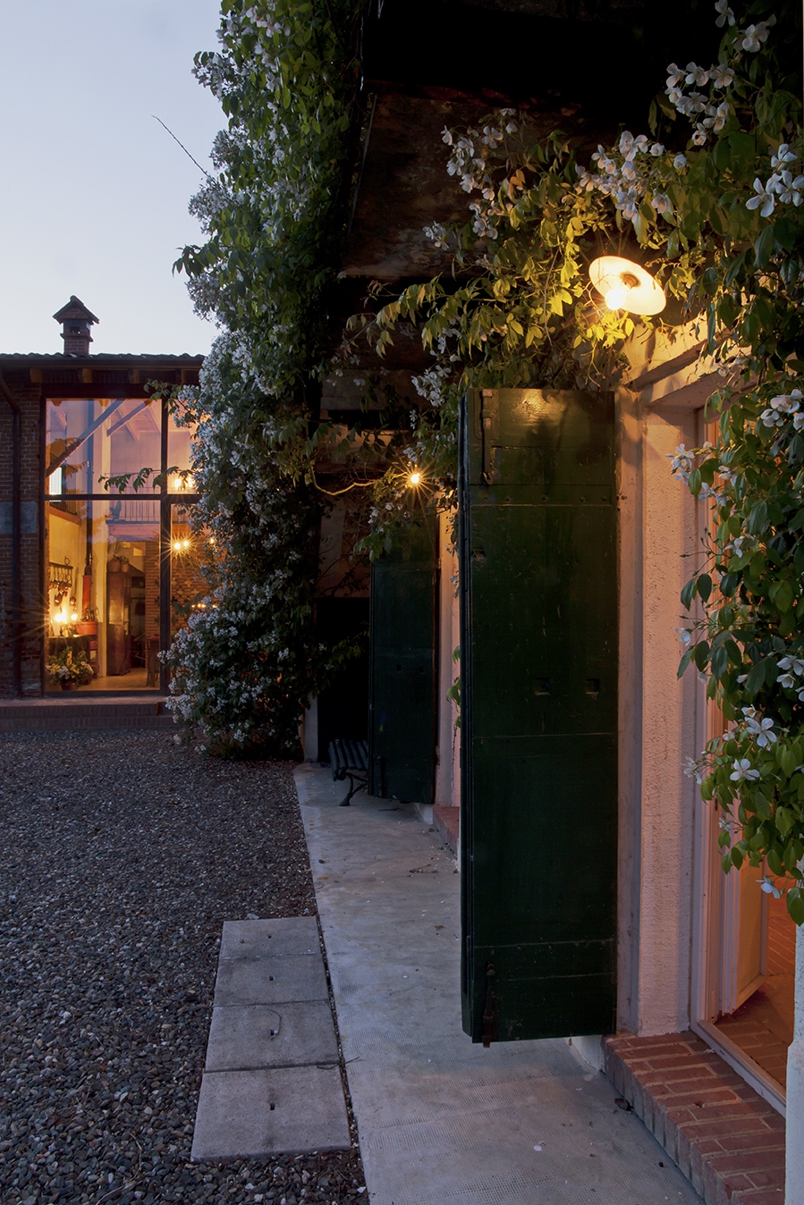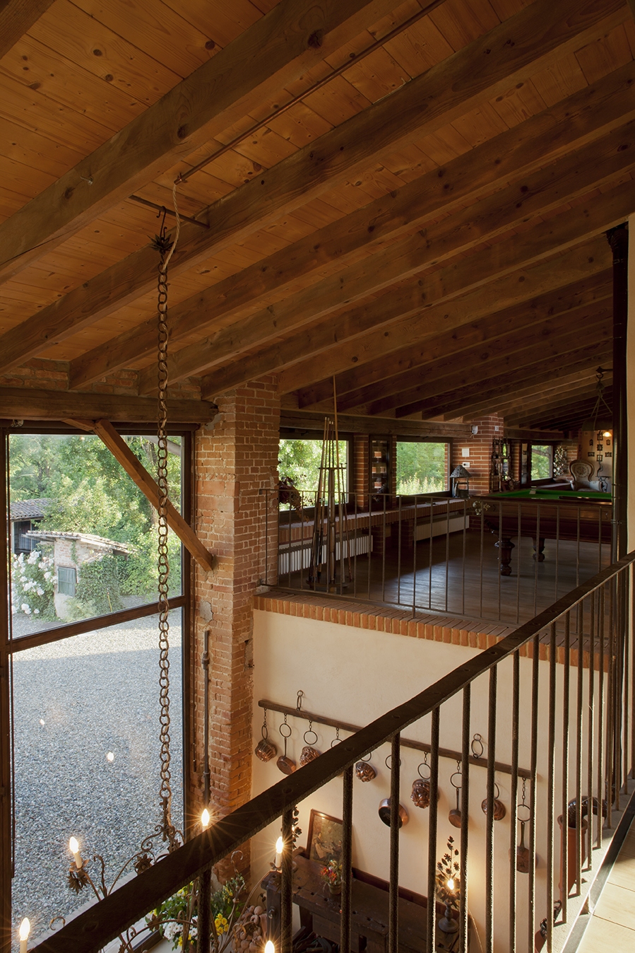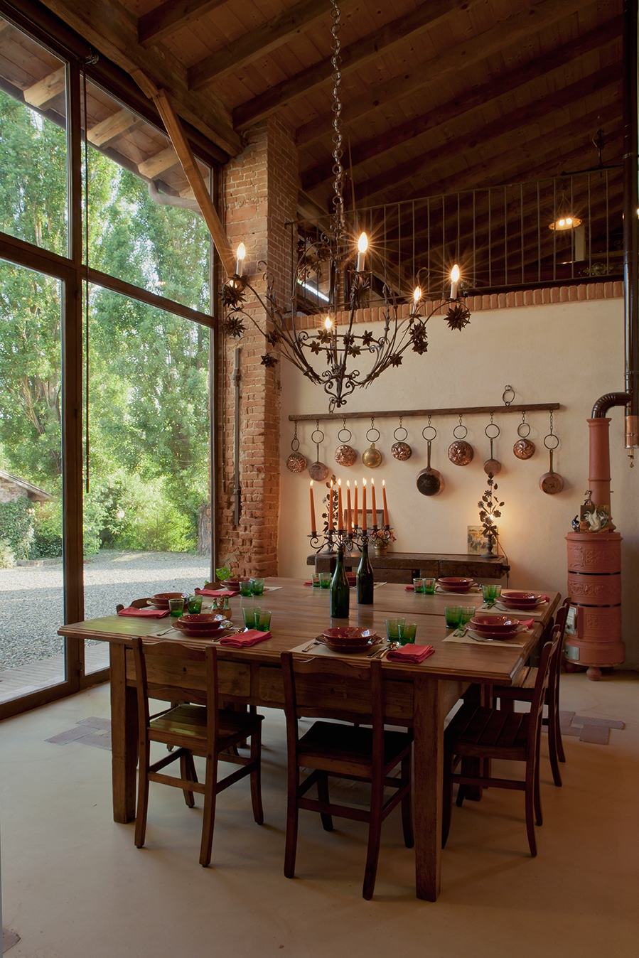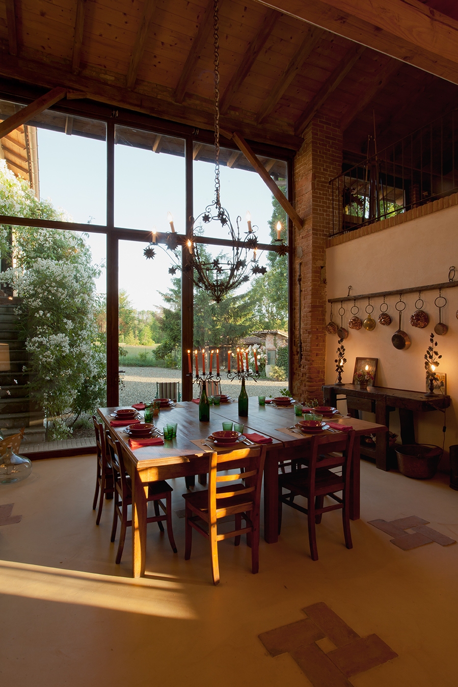 Si sceglie il fienile come spazio da trasformare in ingresso e come fulcro della convivialità in cui sostare attorno ad una grande tavolo quadrato.