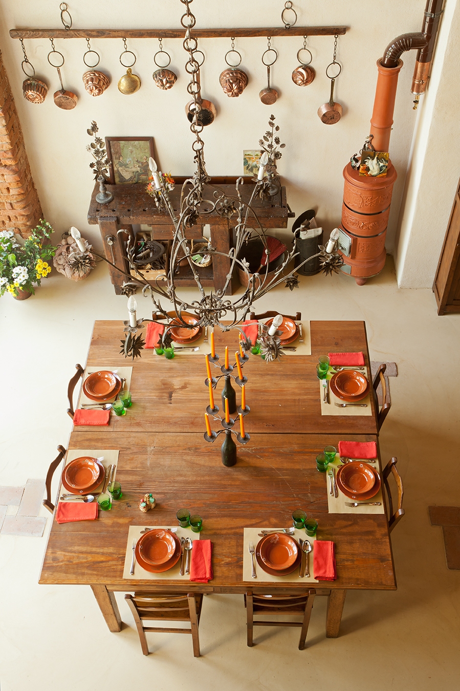 Un grande lampadario illumina la tavola sospeso con una lunga catena in ferro.