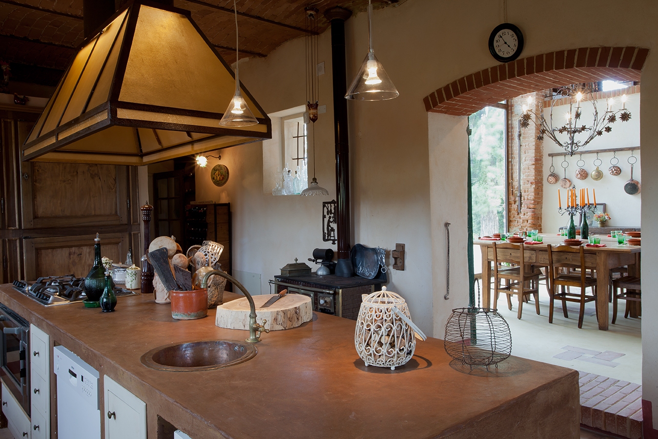 La cucina ospita un’isola centrale di 4 metri di lunghezza, glassata di resina color moka, utilizzata come piano di lavoro e cottura.