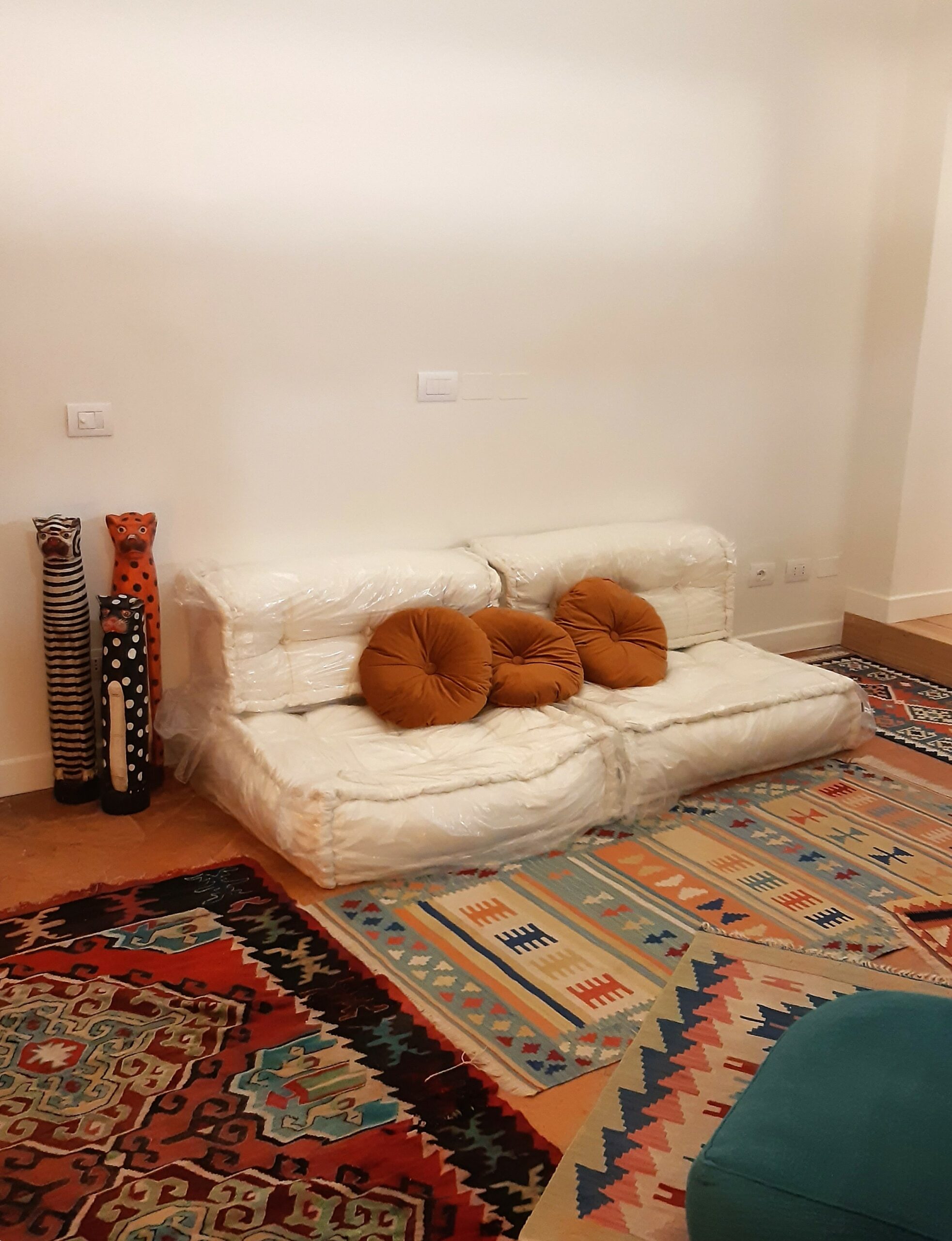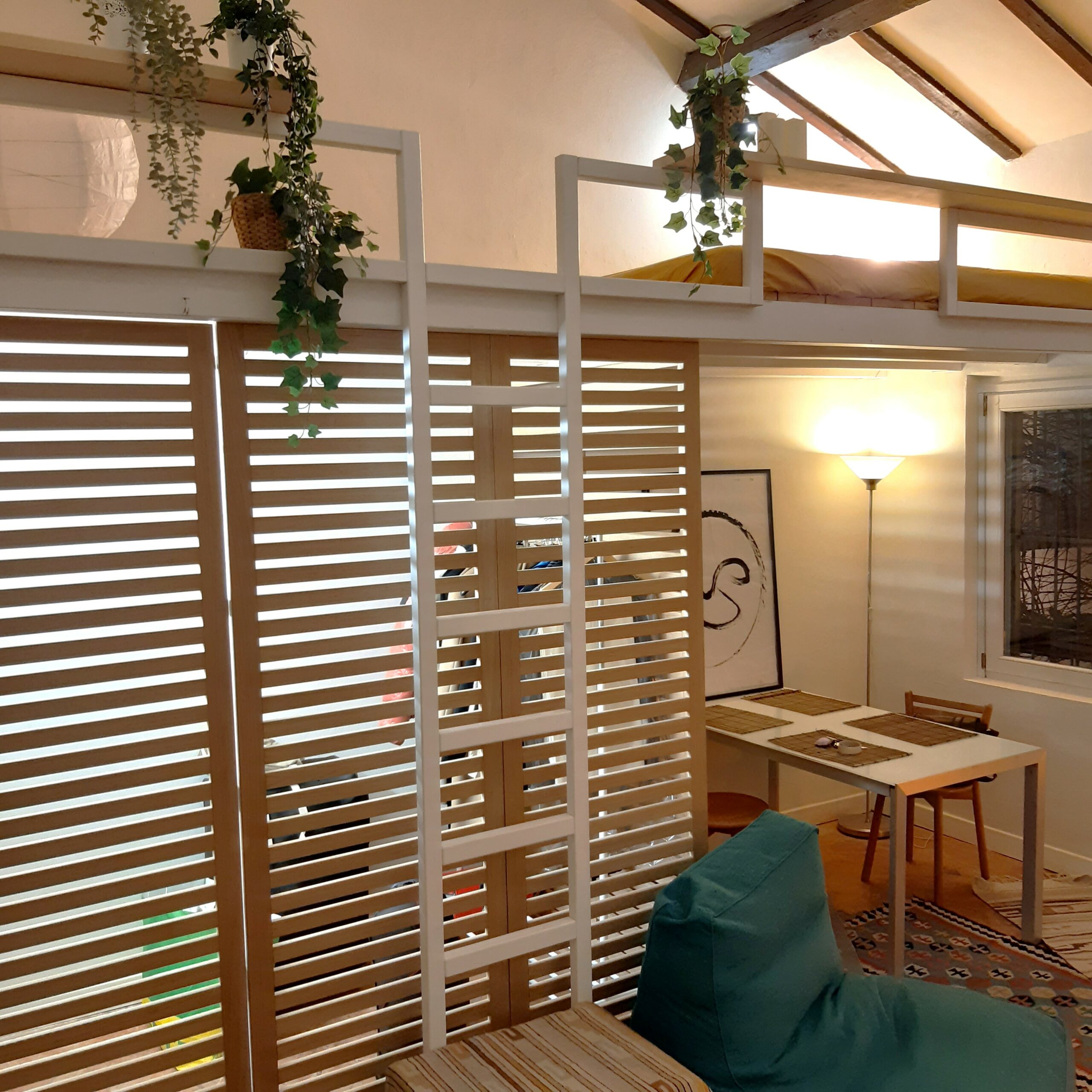 Il soppalco su misura è l’elemento distintivo dell’abitazione: nella parte superiore ospita una camera da letto per gli ospiti, mentre nella zona inferiore integra un armadio capiente, unendo estetica e praticità in un unico gesto progettuale. Materiali caldi e dettagli accurati rendono l’ambiente accogliente e versatile, perfetto per la vita dinamica della città.