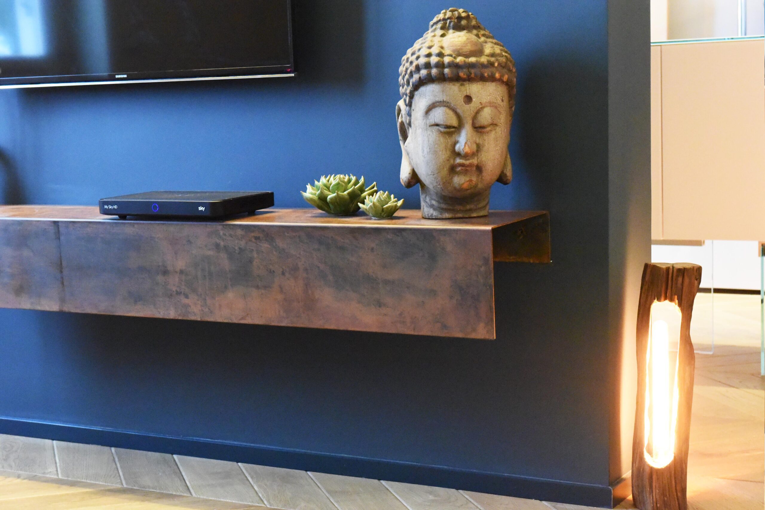 Pe rrafforzare la composizione scegliamo di inserire un “elemento fuoco”, il metallo corten, che scalda e incornicia i vari passaggi della casa: dal pranzo alla camera da letto si snodano librerie con ripiani sapientemente sfalsati per dare spazio alle fotografie della padrona di casa e ai suoi numerosi libri, cosi come nella zona antistante il bagno e lo studio. In questa libreria metallica sono incastonati dei bussolotti in legno laccato chiusi, che celano al loro interno oggetti privati.