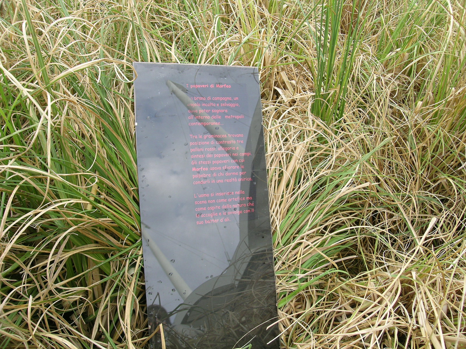 Tra le graminacee trovano posizione di contrasto tre palloni rossi, allegoria e sintesi dei papaveri nei campi. Gli stessi papaveri con cui Morfeo usava sfiorare le palpebre di chi dorme, per condurli in una realtà onirica.