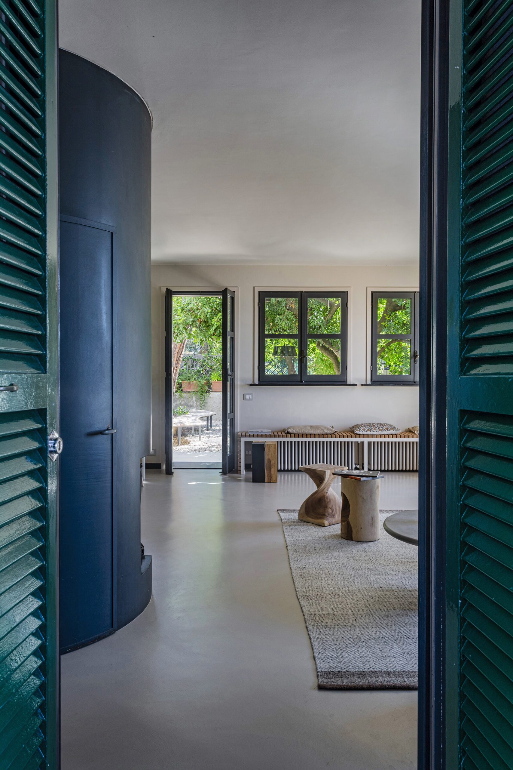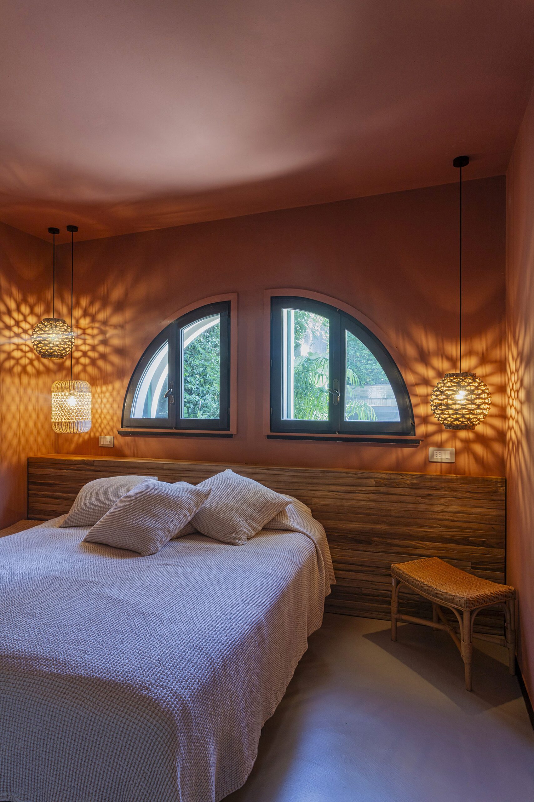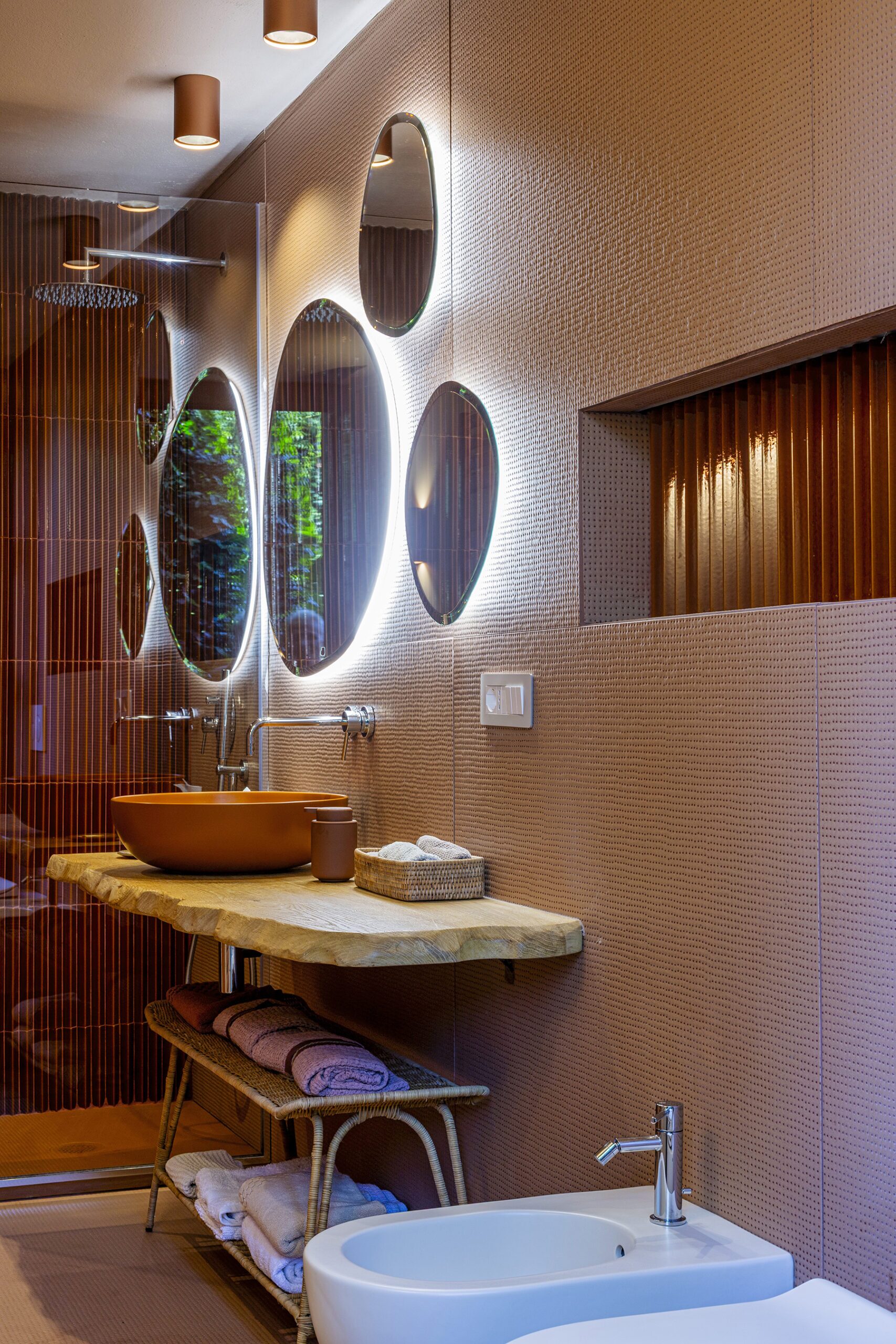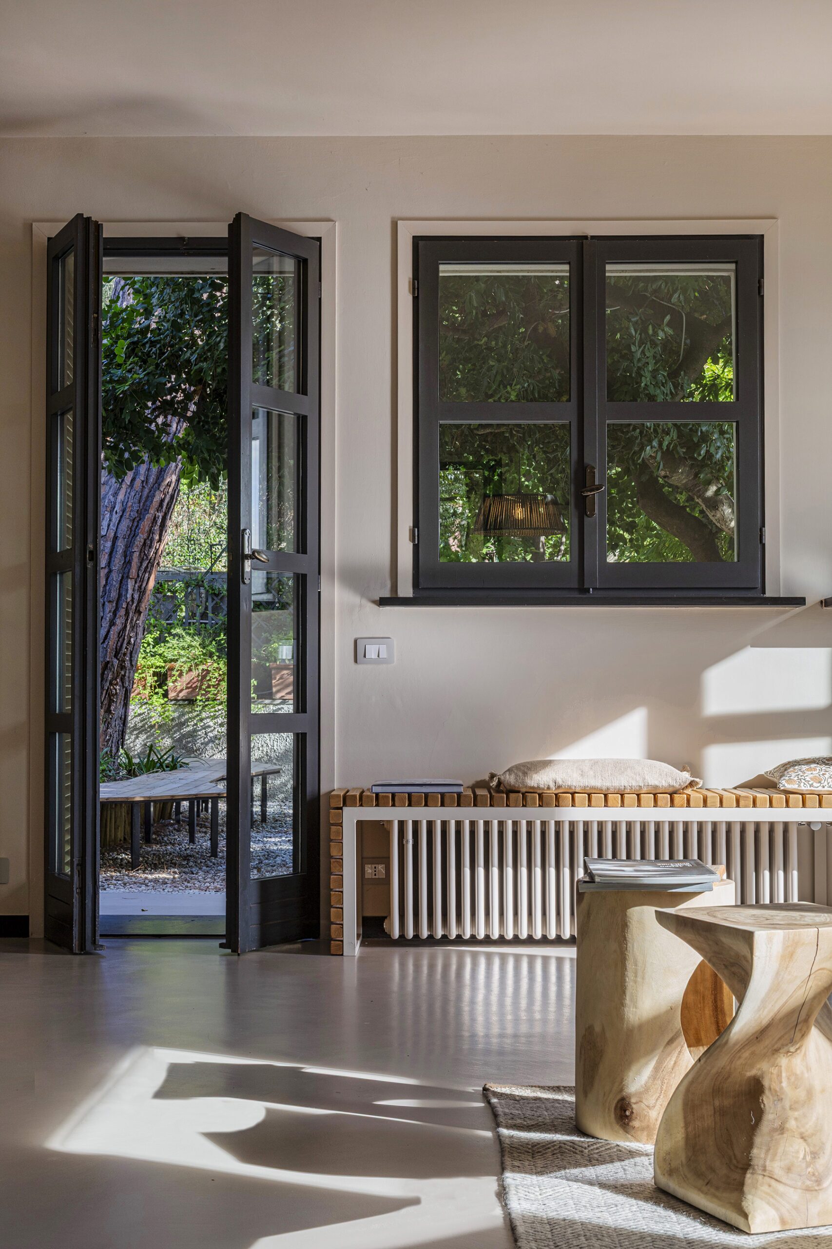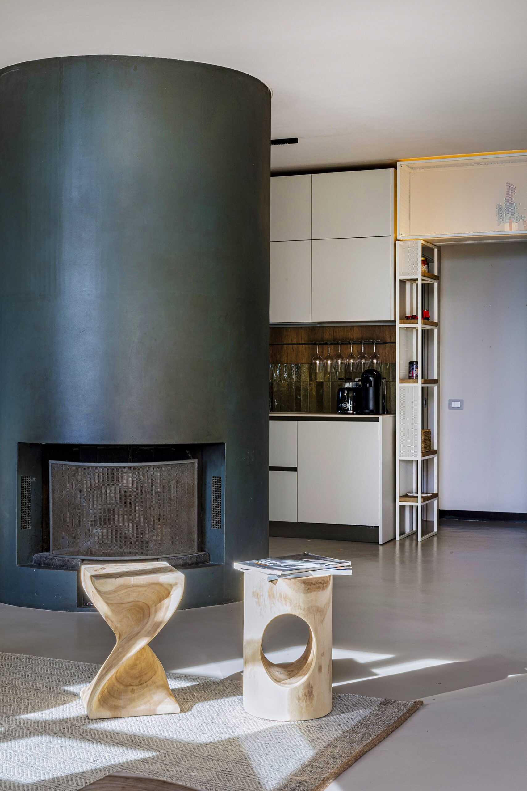 Al piano principale si ricerca un continuum tra interno ed esterno: gli arredi in legno, realizzati su misura e disegnati per evocare le grandi cortecce dei pini domestici che circondano la casa, diventano elemento di connessione con la natura. Le finiture in legno e metallo chiaro valorizzano la luce e la matericità degli spazi, mentre i bagni si distinguono per la loro personalità: uno dalle atmosfere scandinave, sobrio e luminoso, l’altro avvolto da tonalità terracotta che richiamano la terra e il calore mediterraneo.