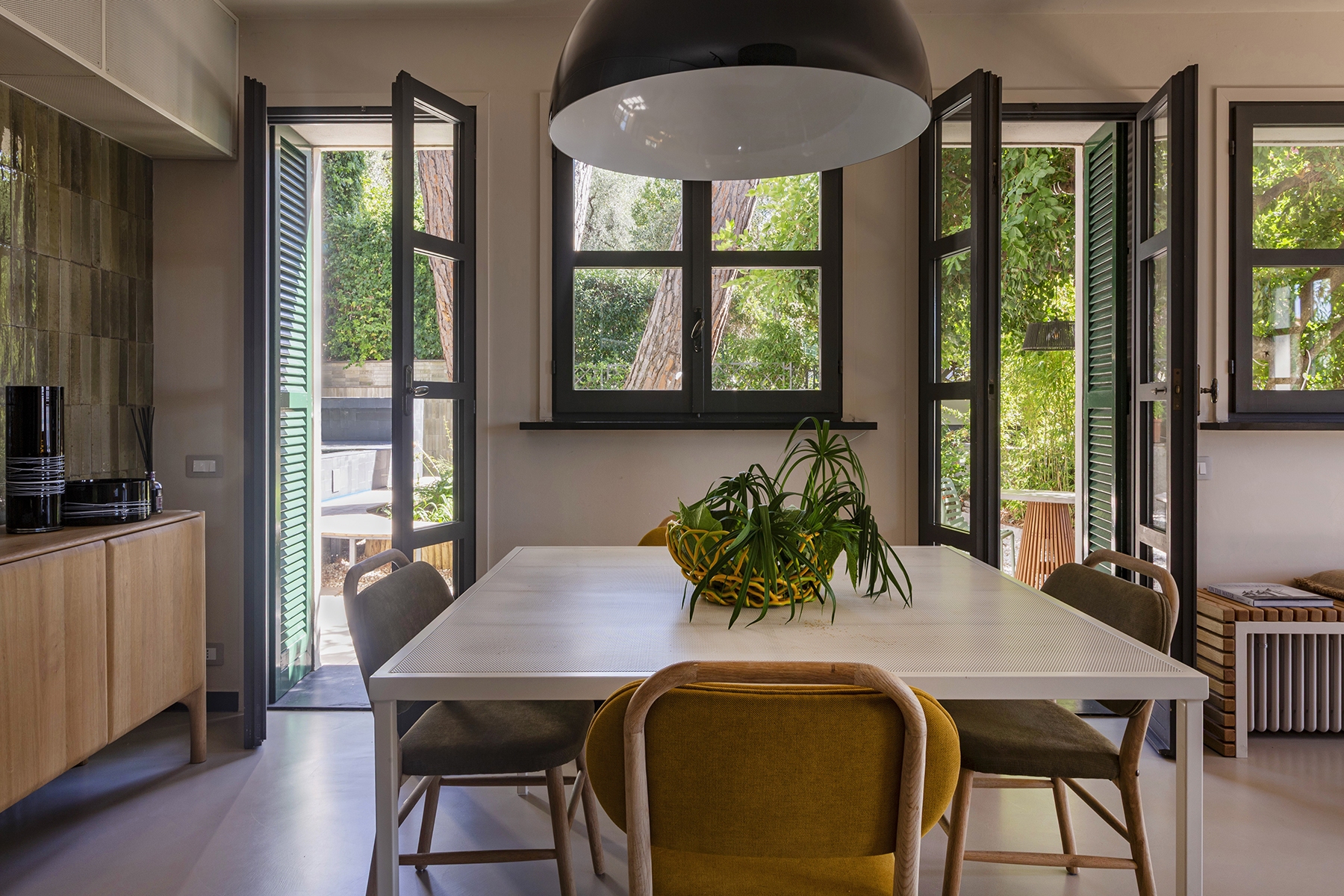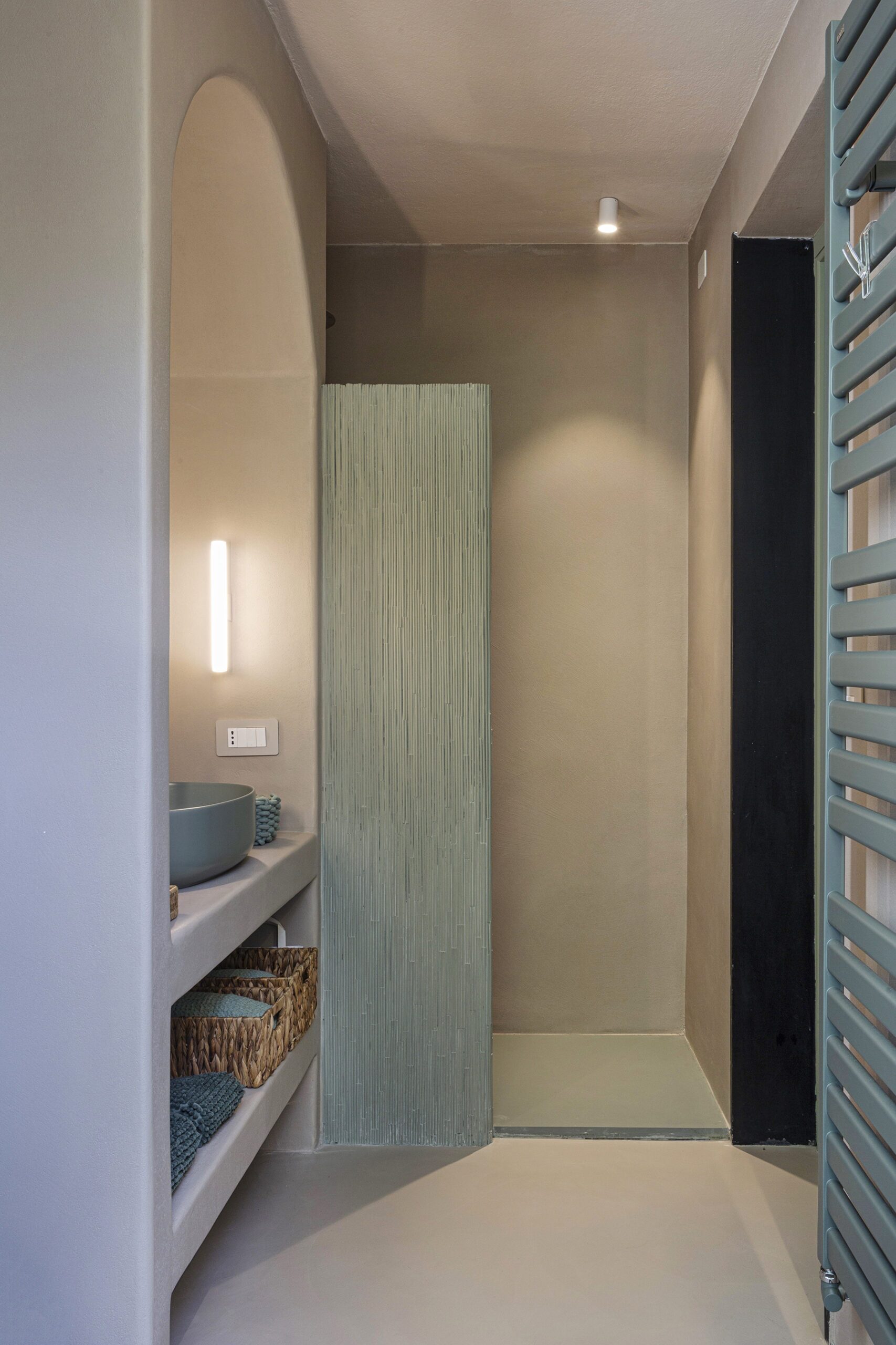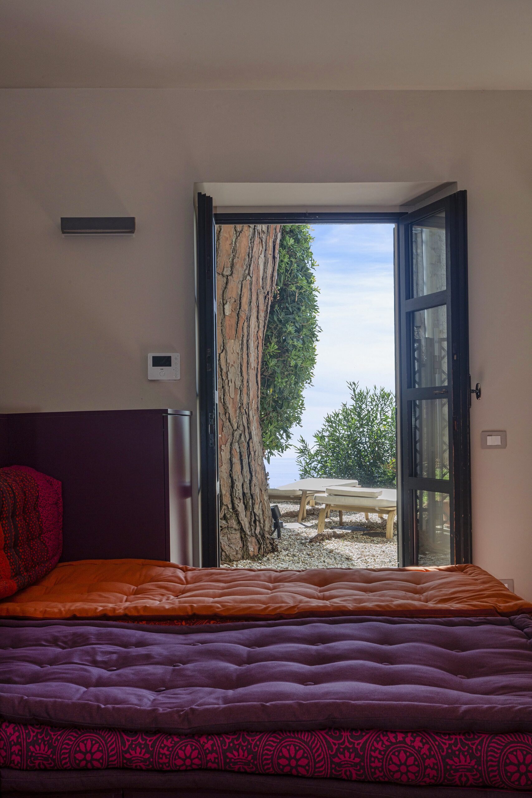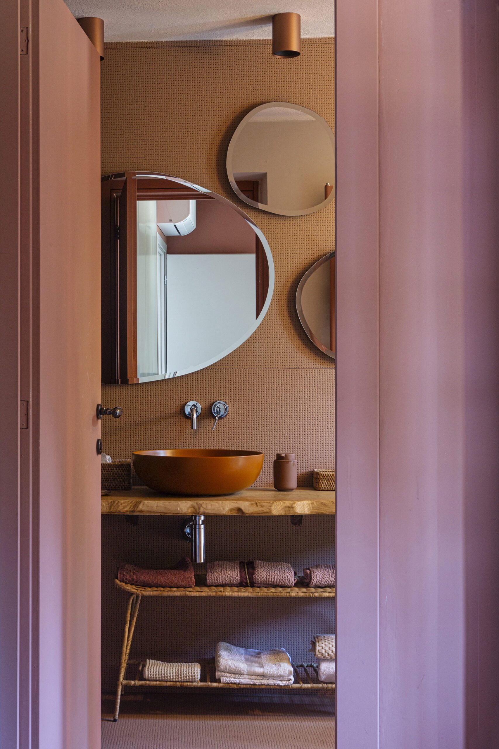 Al piano principale si ricerca un continuum tra interno ed esterno: gli arredi in legno, realizzati su misura e disegnati per evocare le grandi cortecce dei pini domestici che circondano la casa, diventano elemento di connessione con la natura. Le finiture in legno e metallo chiaro valorizzano la luce e la matericità degli spazi, mentre i bagni si distinguono per la loro personalità: uno dalle atmosfere scandinave, sobrio e luminoso, l’altro avvolto da tonalità terracotta che richiamano la terra e il calore mediterraneo.