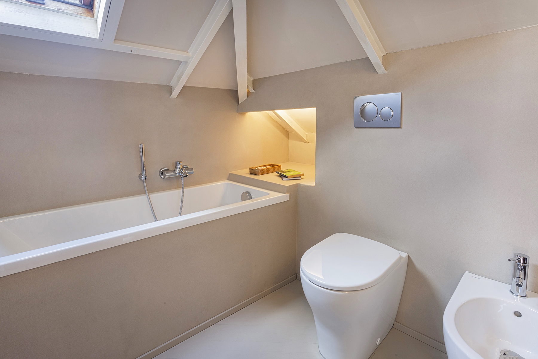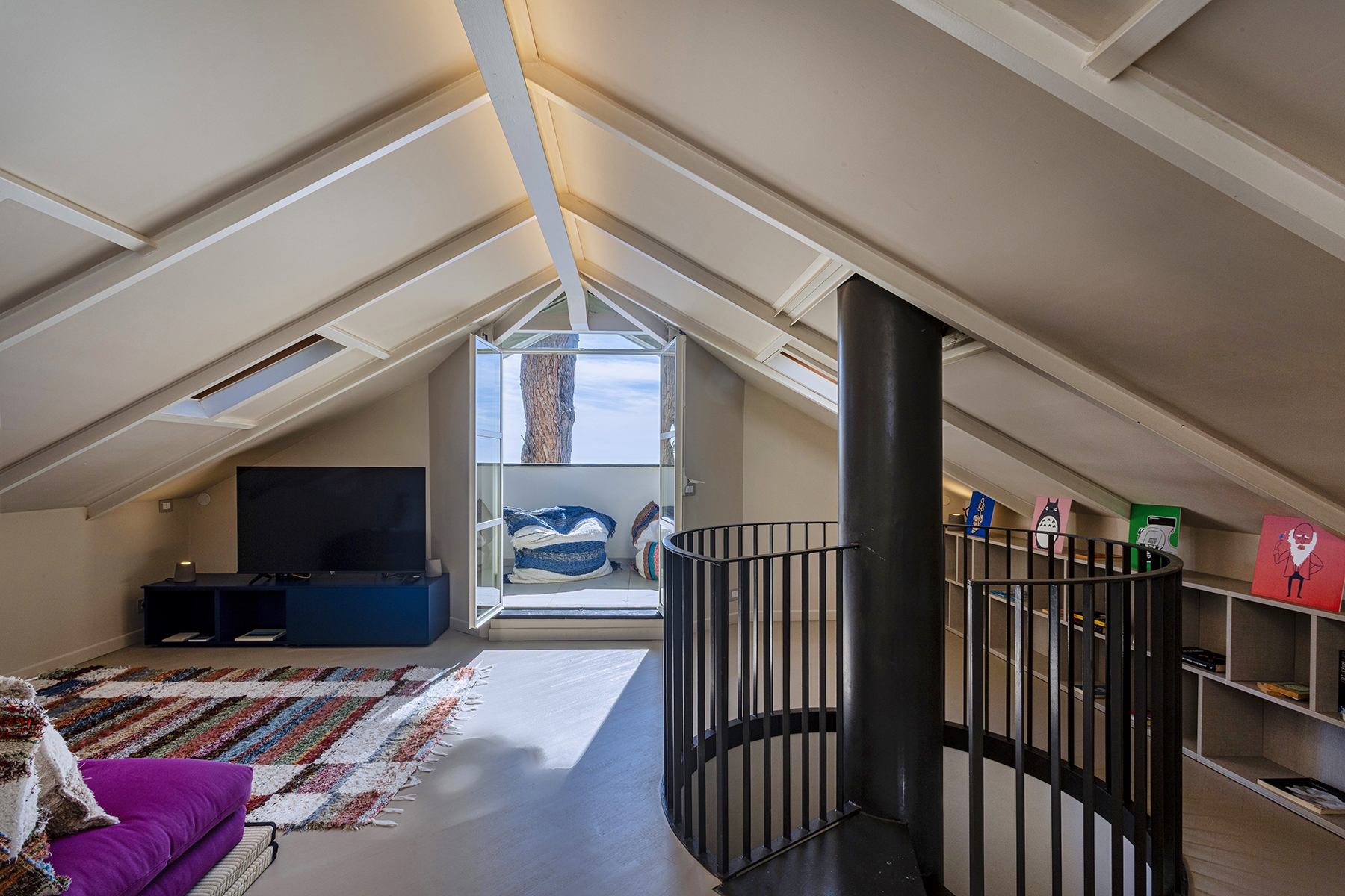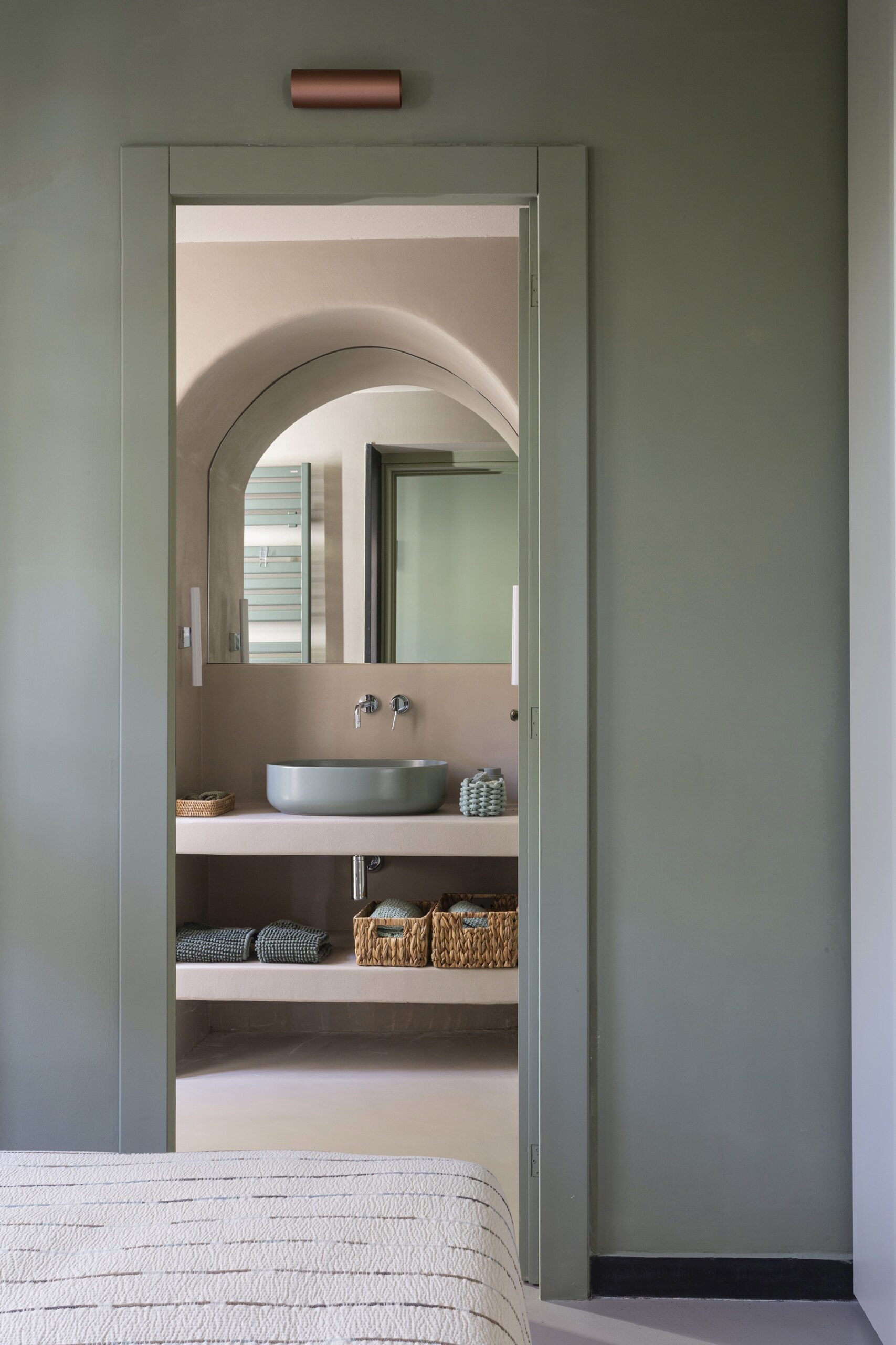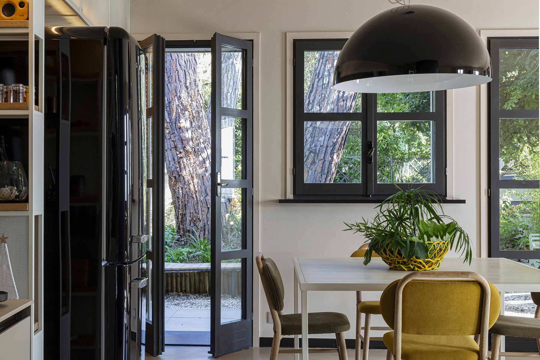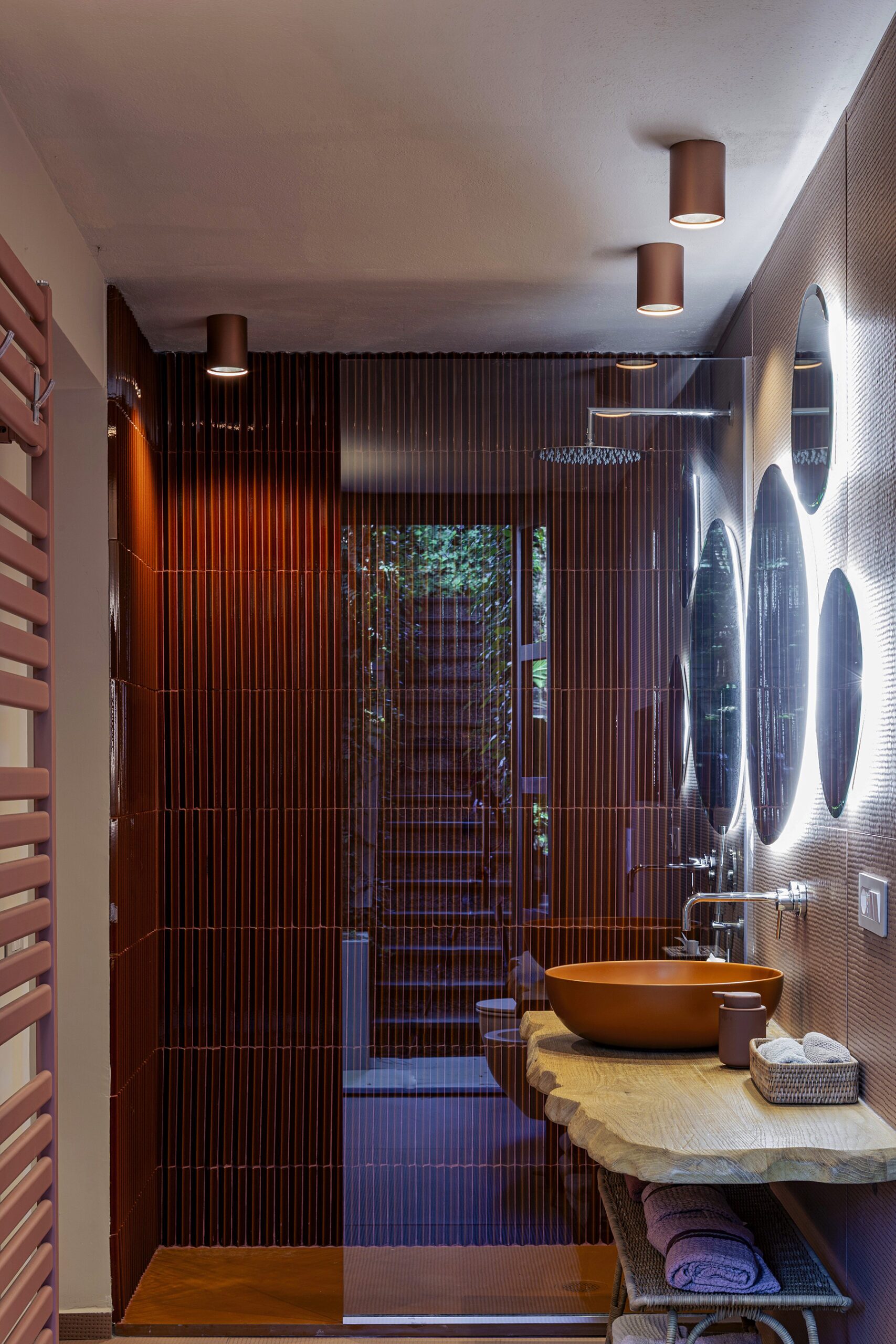 Al piano principale si ricerca un continuum tra interno ed esterno: gli arredi in legno, realizzati su misura e disegnati per evocare le grandi cortecce dei pini domestici che circondano la casa, diventano elemento di connessione con la natura. Le finiture in legno e metallo chiaro valorizzano la luce e la matericità degli spazi, mentre i bagni si distinguono per la loro personalità: uno dalle atmosfere scandinave, sobrio e luminoso, l’altro avvolto da tonalità terracotta che richiamano la terra e il calore mediterraneo.