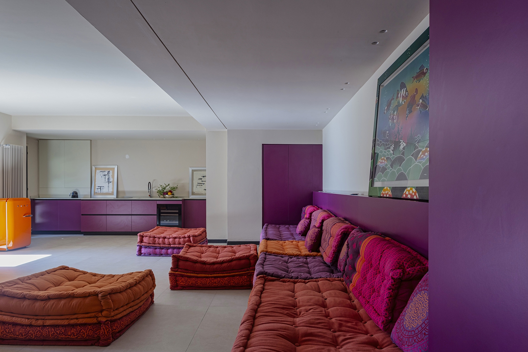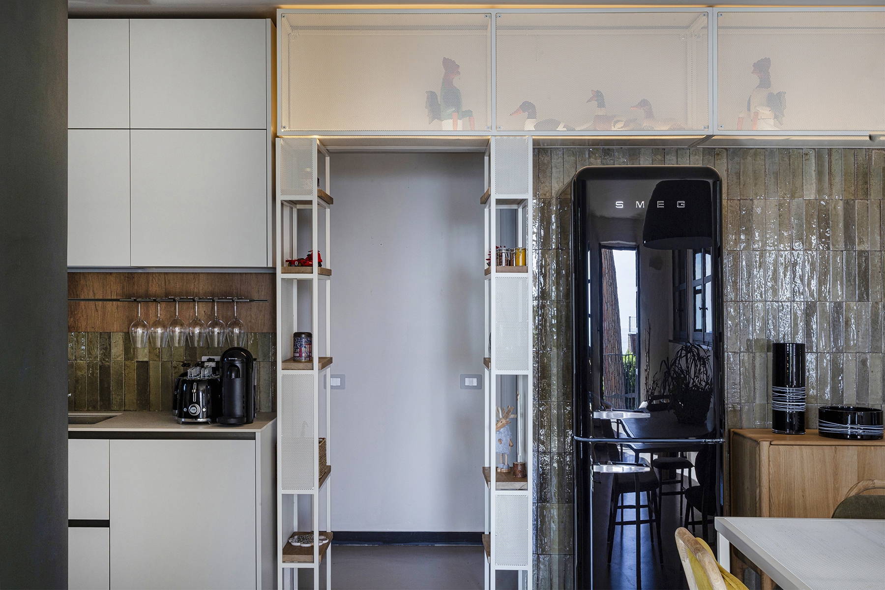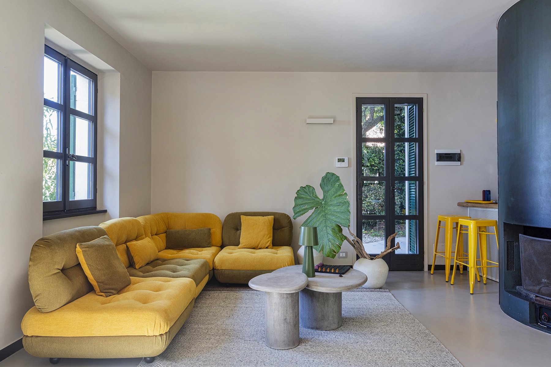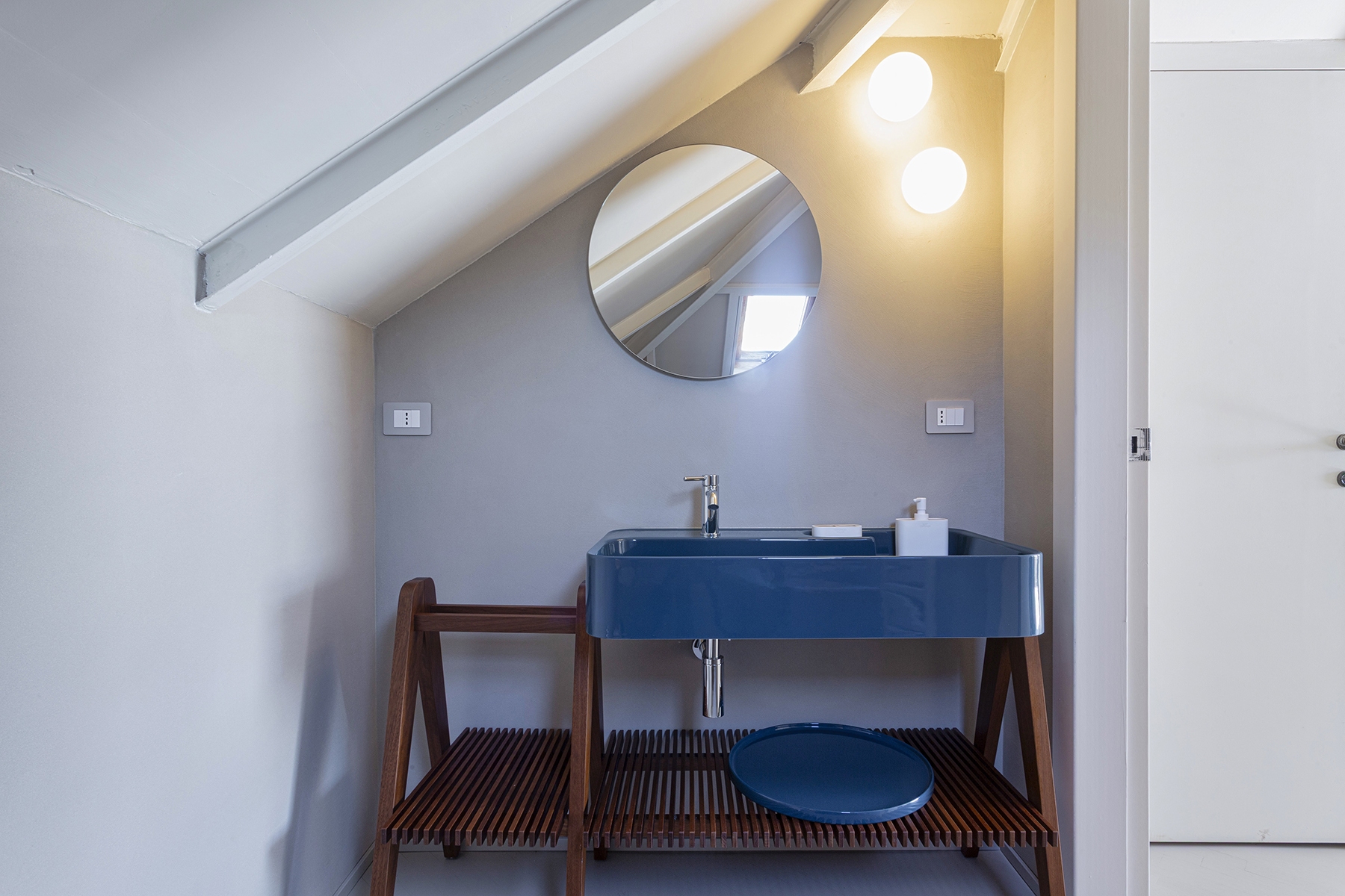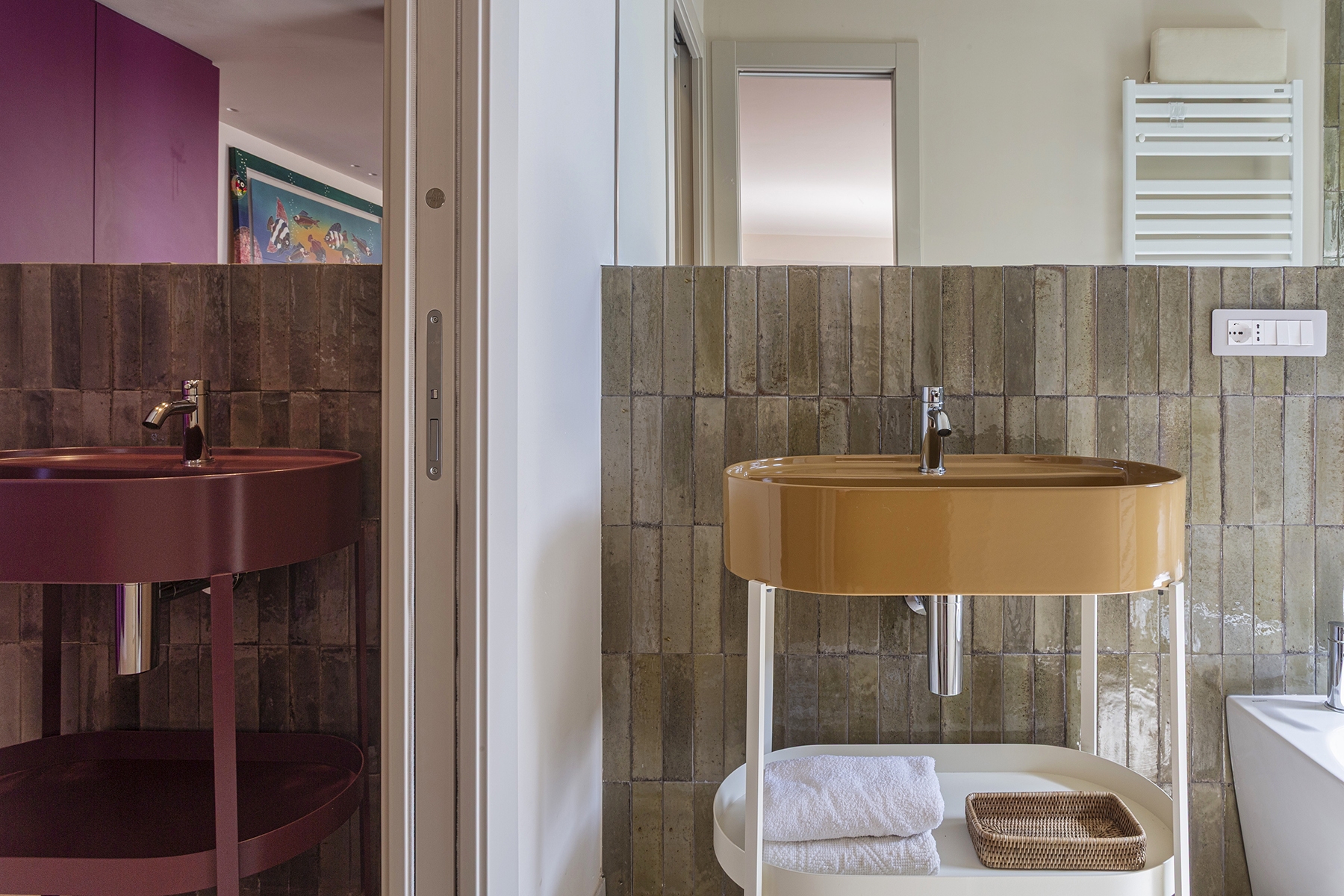 Al piano principale si ricerca un continuum tra interno ed esterno: gli arredi in legno, realizzati su misura e disegnati per evocare le grandi cortecce dei pini domestici che circondano la casa, diventano elemento di connessione con la natura. Le finiture in legno e metallo chiaro valorizzano la luce e la matericità degli spazi, mentre i bagni si distinguono per la loro personalità: uno dalle atmosfere scandinave, sobrio e luminoso, l’altro avvolto da tonalità terracotta che richiamano la terra e il calore mediterraneo.