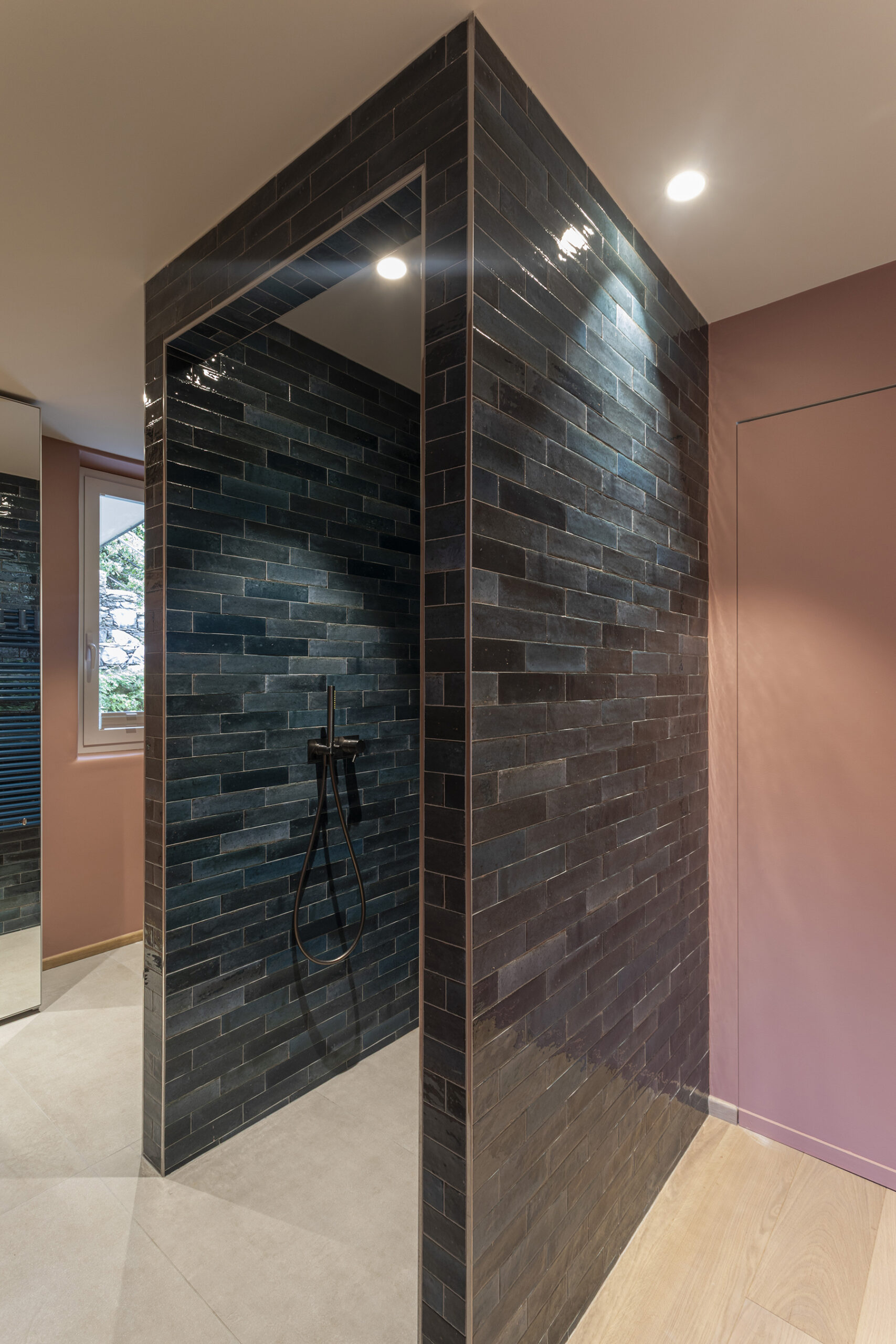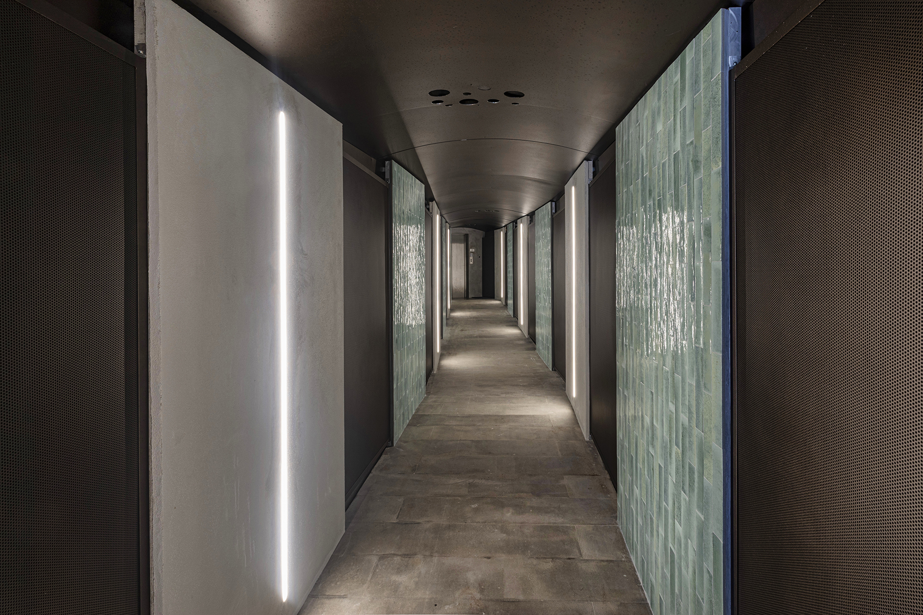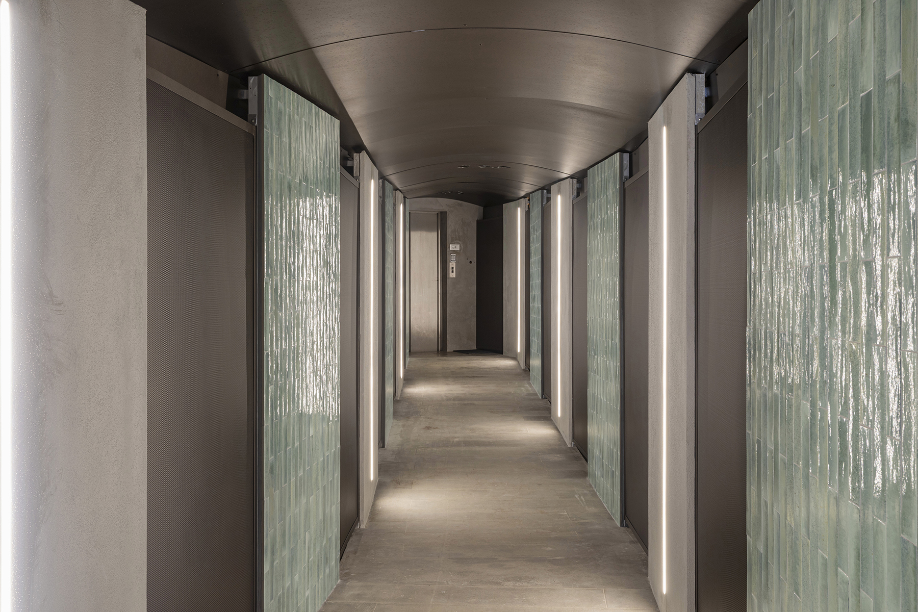 L’ingresso all’abitazione avviene attraverso un tunnel, che collega il garage all’ascensore, al quale si è dedicata una ricerca scenografica.