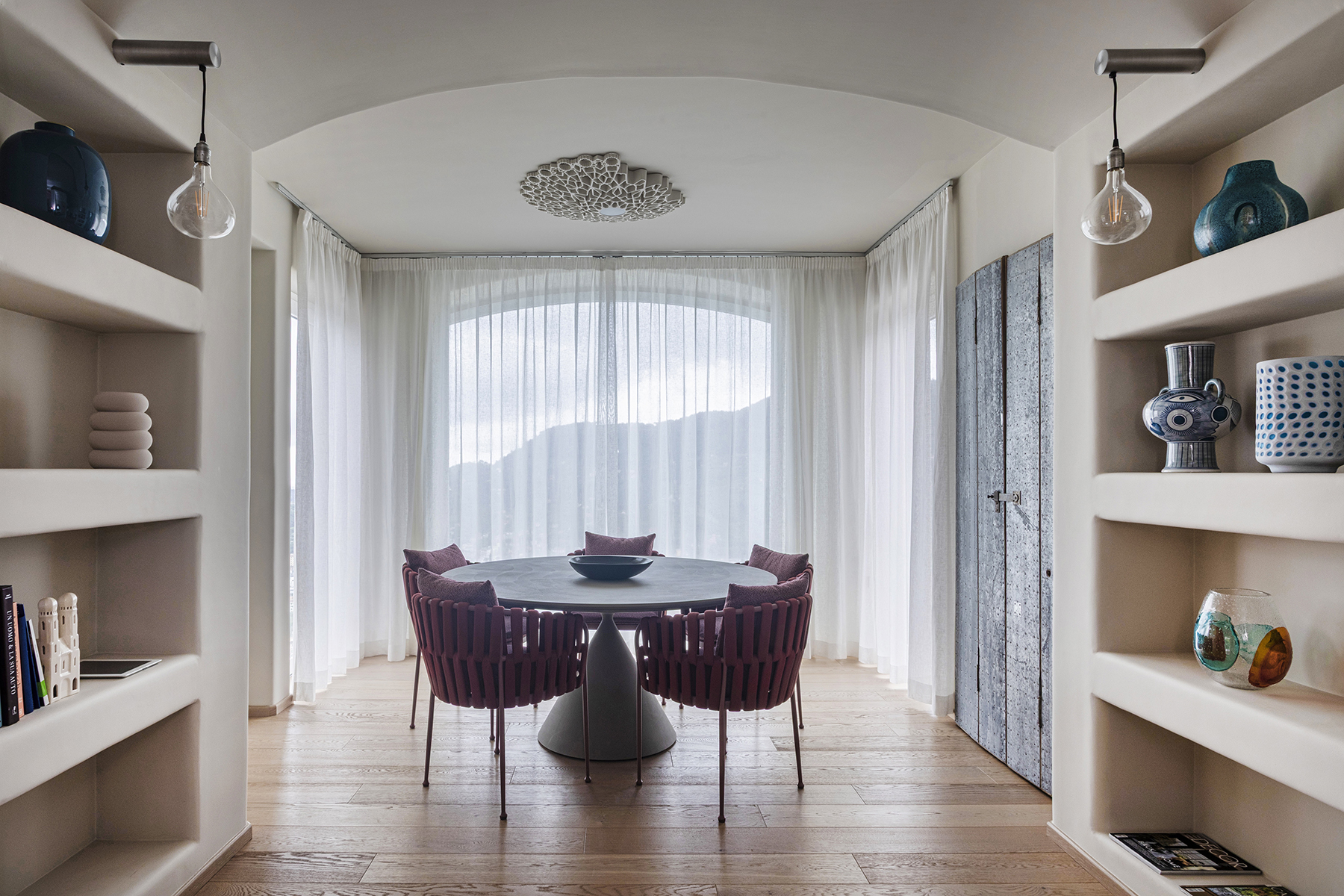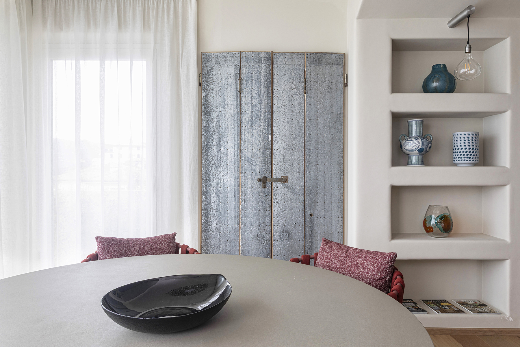 Anche le porte in metallo, tra le nicchie della sala da pranzo, sono di recupero. Le ampie finestrate sul panorama inondano di luce il soggiorno, tanto da costringere anche Snoopy ad indossare gli occhiali da sole.