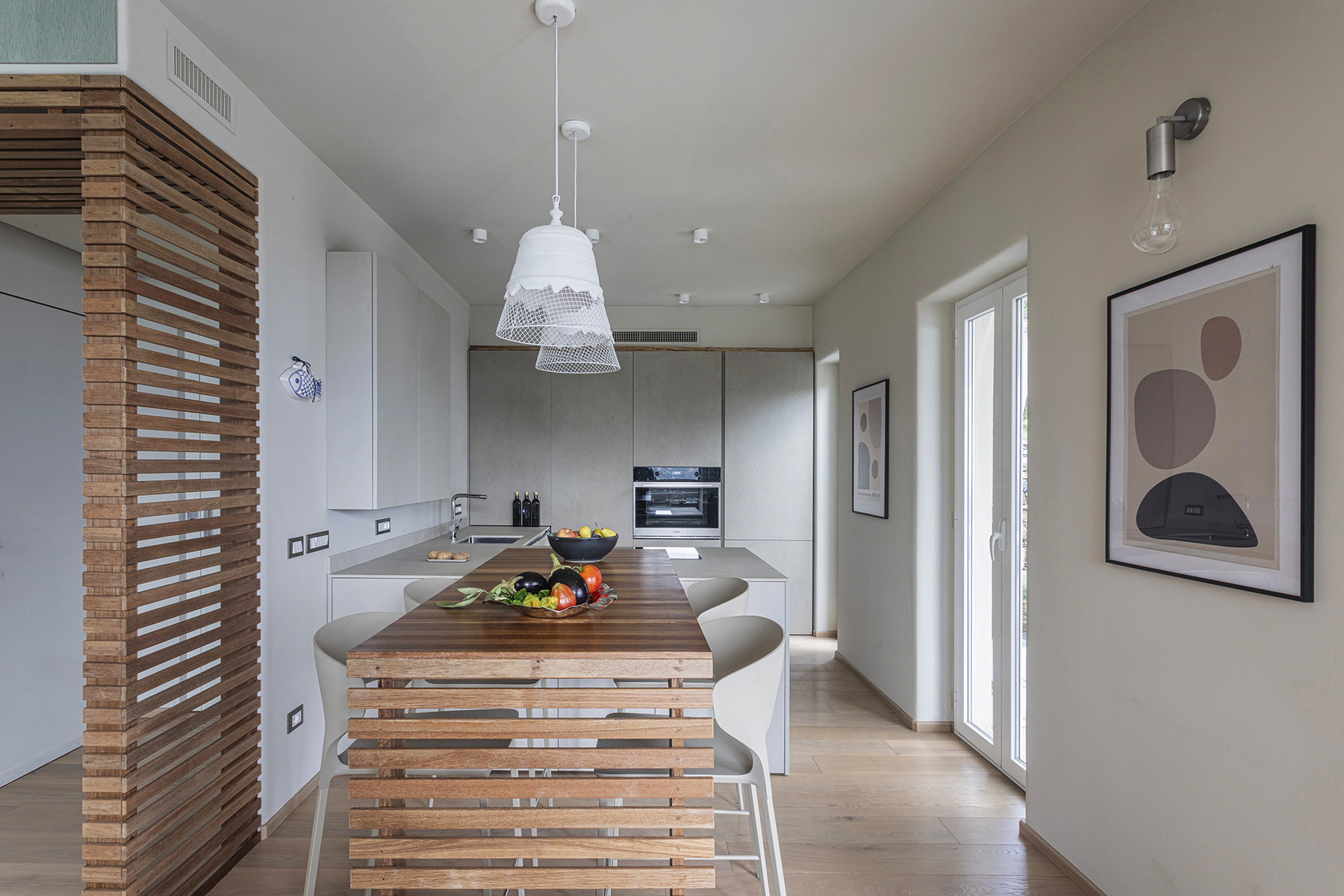 Il livello principale della casa accoglie con una cucina open space, raccolta in un’ampia nicchia.