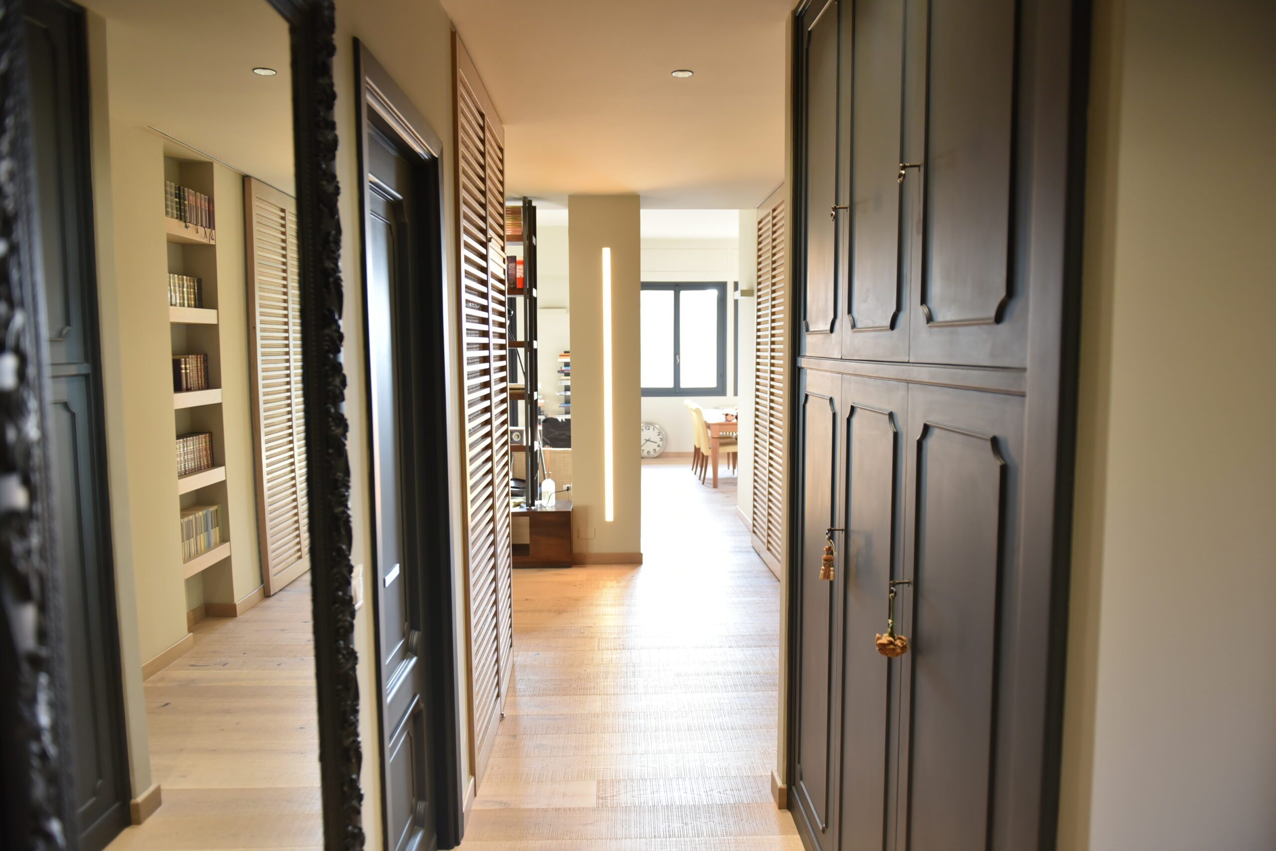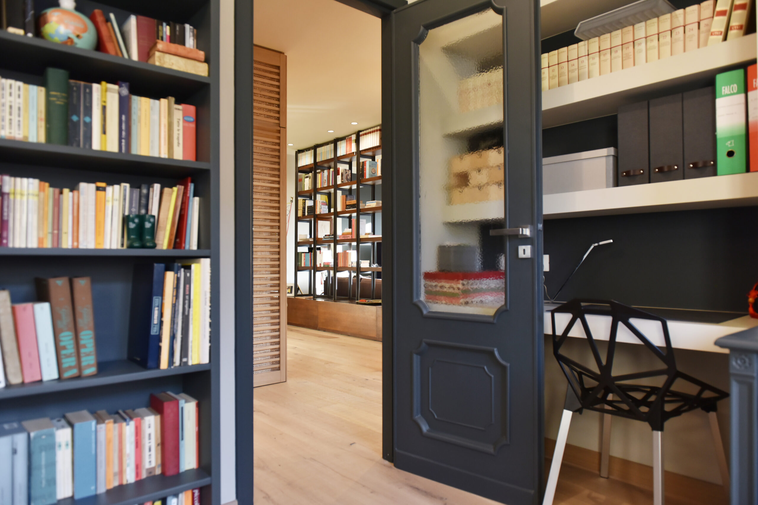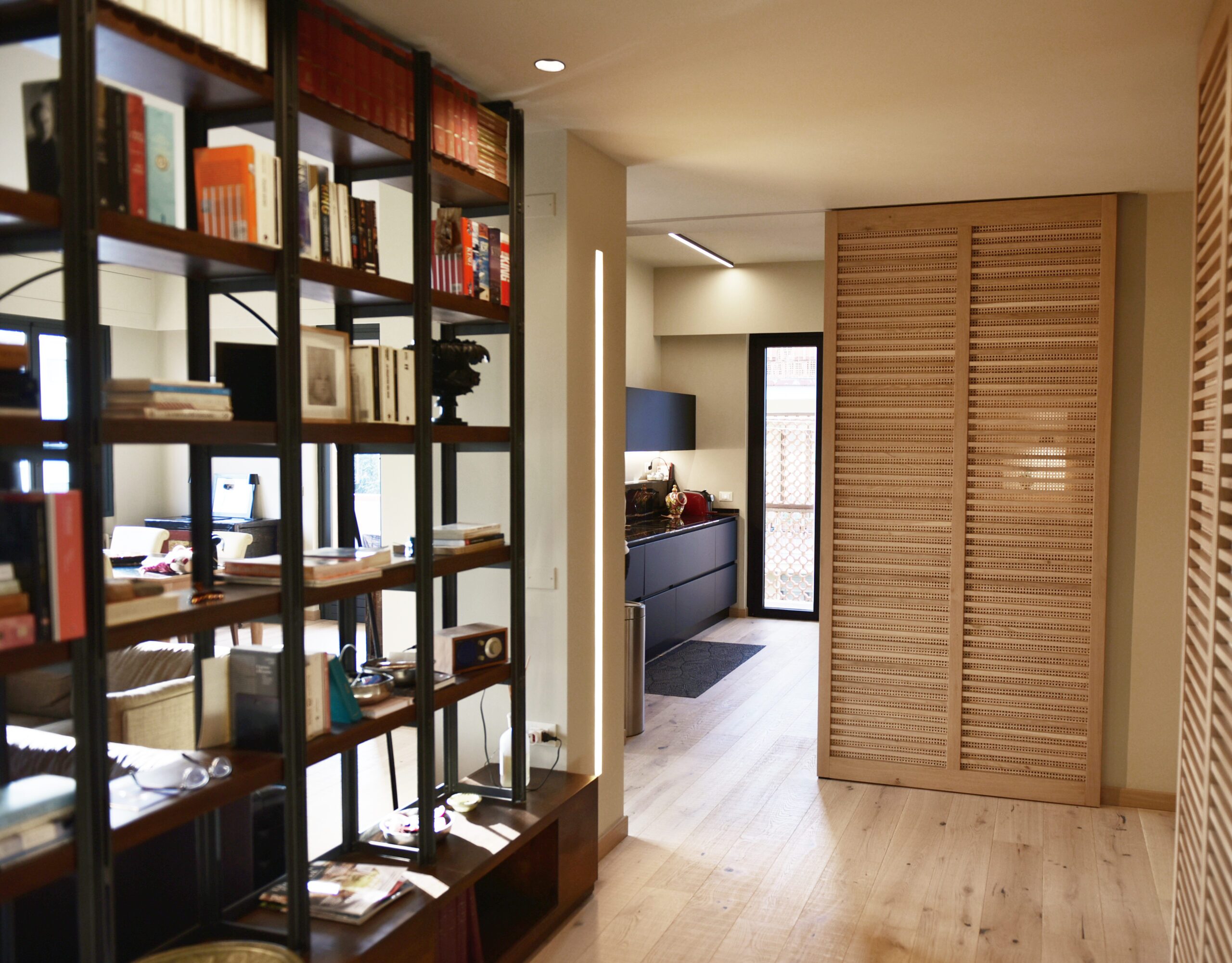 La committenza ha scelto di affidarsi completamente alla visione dell’architetto, dando vita a un progetto coerente e dal carattere deciso. Gli inserti neri, dalle porte alla cucina, fino ai dettagli dei controsoffitti, dialogano con le tonalità chiare del legno, costruendo un contrasto elegante e misurato.