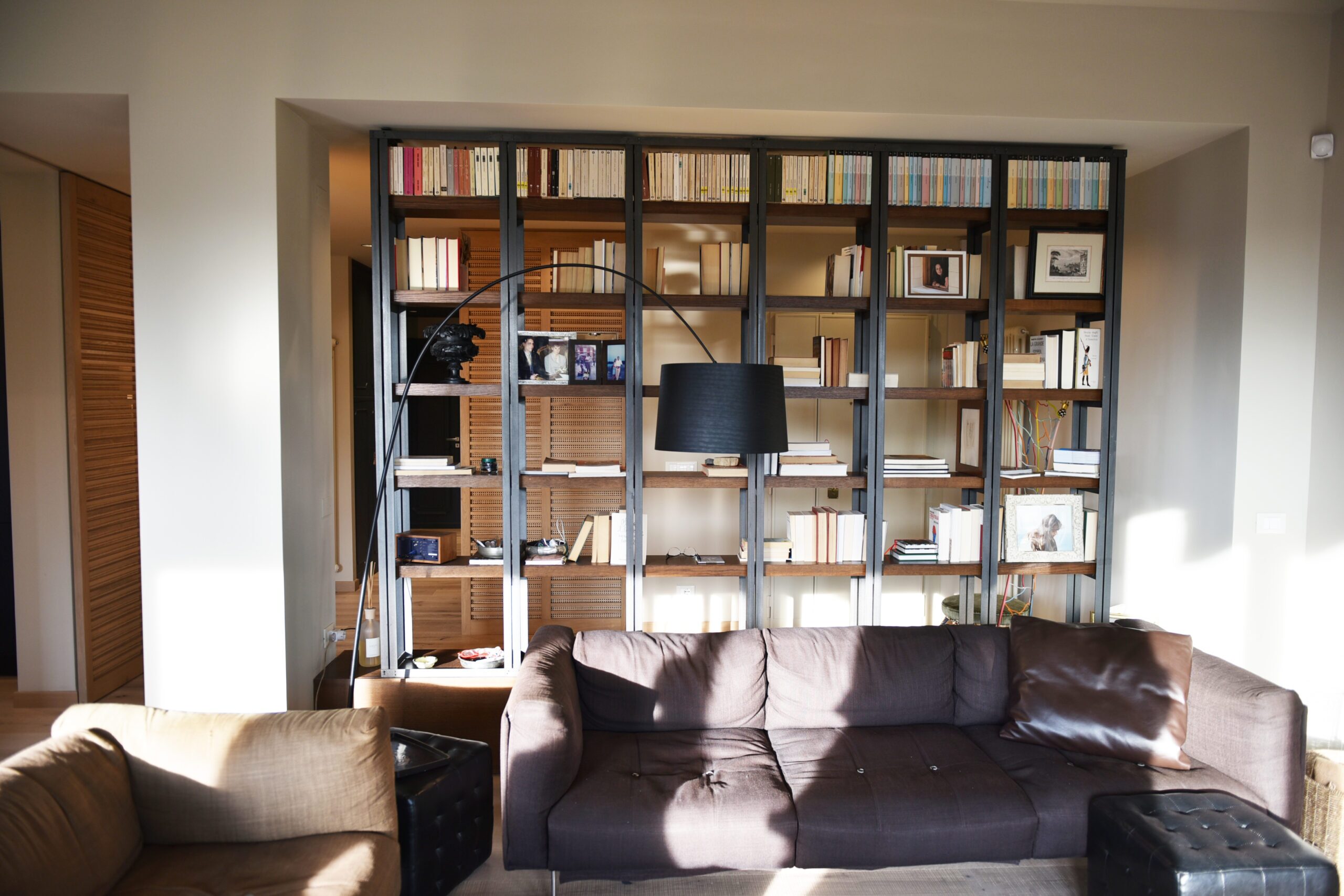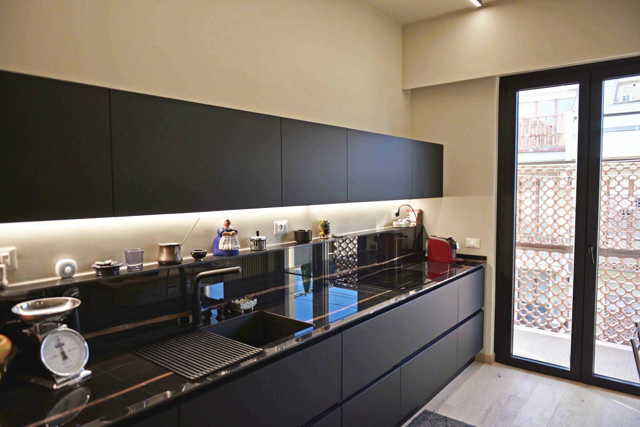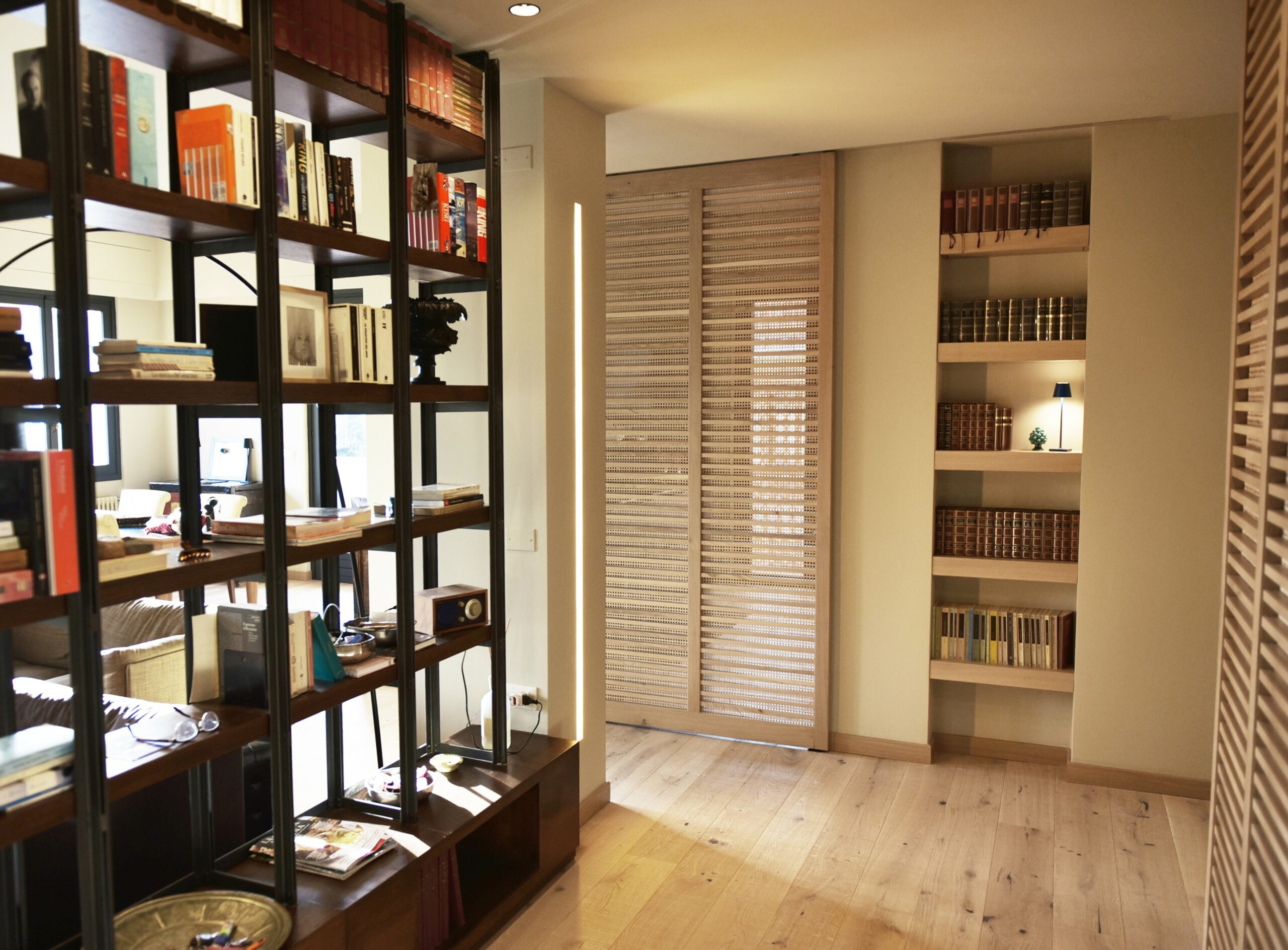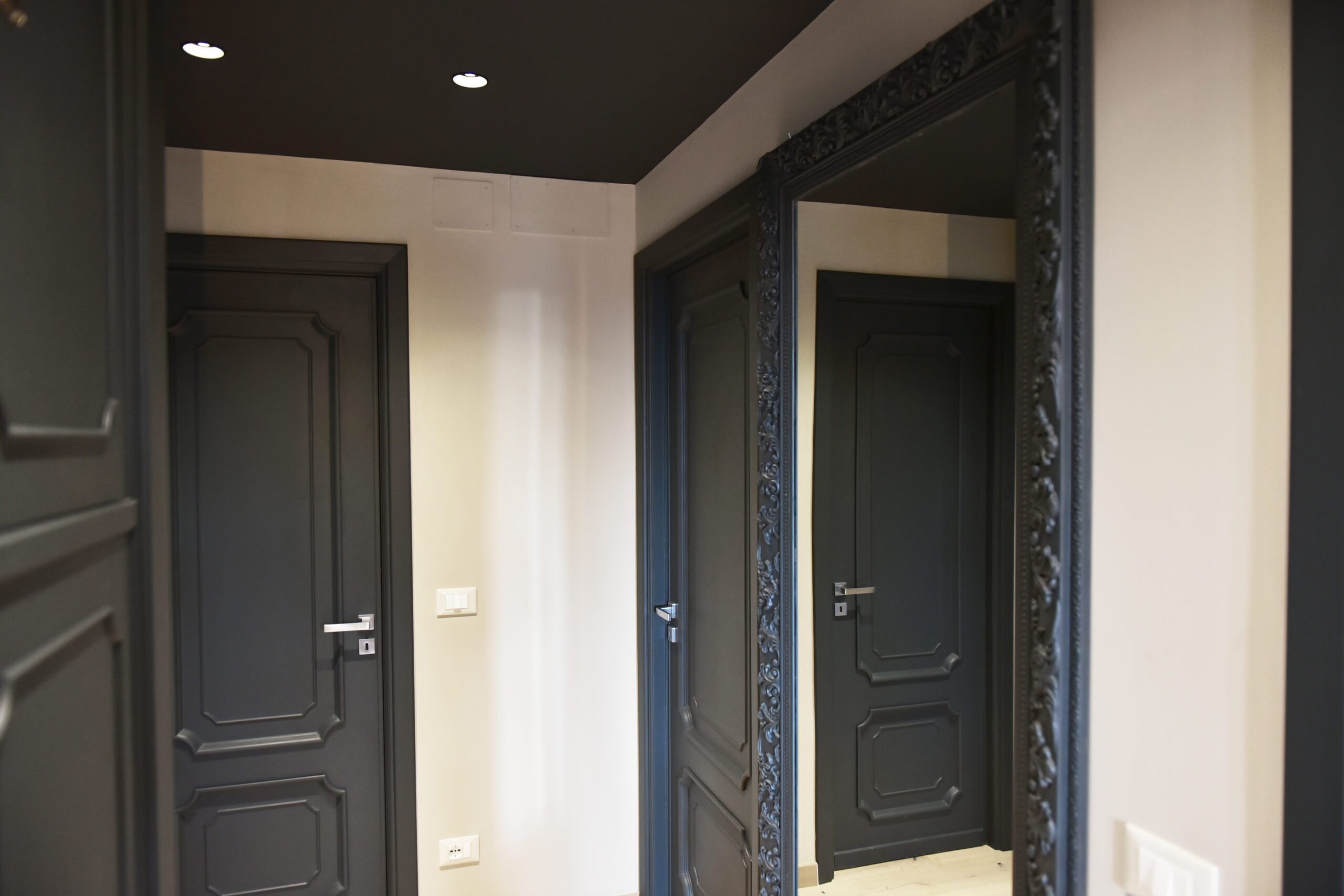 La committenza ha scelto di affidarsi completamente alla visione dell’architetto, dando vita a un progetto coerente e dal carattere deciso. Gli inserti neri, dalle porte alla cucina, fino ai dettagli dei controsoffitti, dialogano con le tonalità chiare del legno, costruendo un contrasto elegante e misurato.