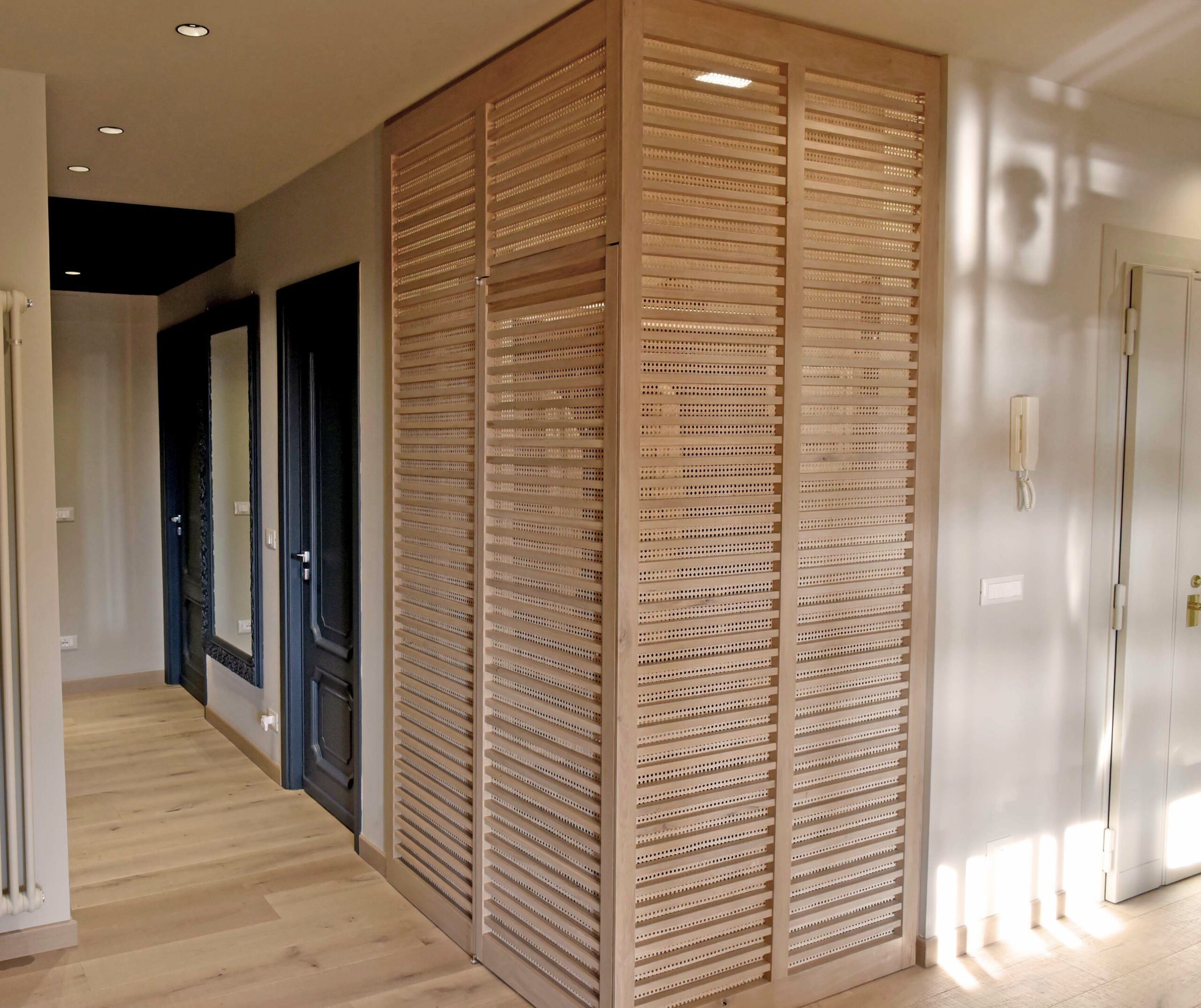 L’ingresso dell’abitazione è caratterizzato da paraventi in legno e ratten, disegnati su misura, che schermano la zona cucina e creano un angolo ripostiglio.