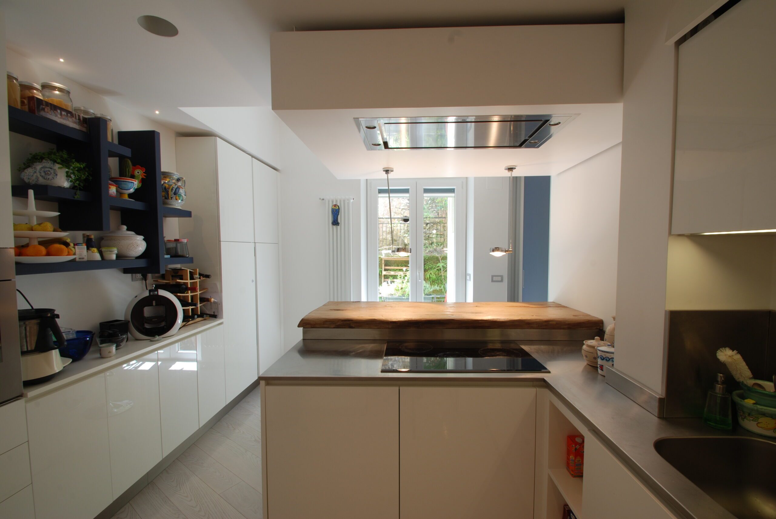 La proprietaria voleva materiali tutti diversi purché bianchi: parquet in listoni lucidi, pareti smaltate, ciottoli in giardino e nella doccia, boiserie che celano armadi a muro, rivestimenti dei bagni e mobili della cucina.
