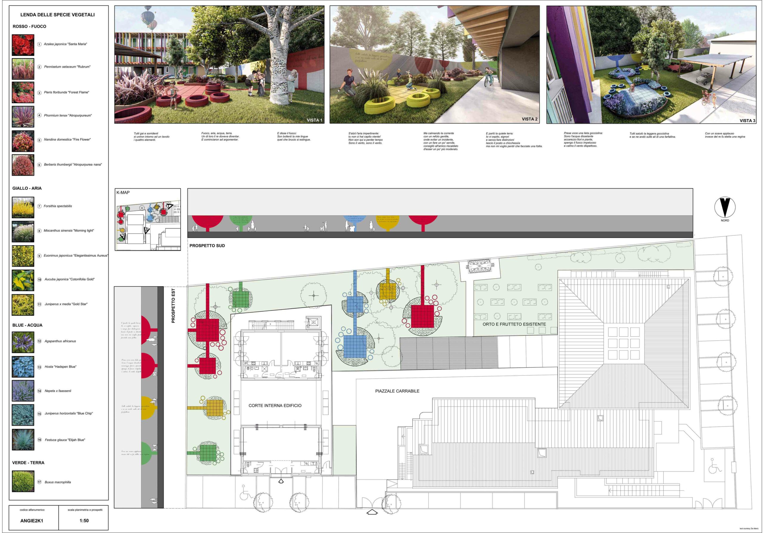 Il progetto di sistemazione del verde nasce con l’obiettivo di valorizzare lo stato di fatto esistente. Seguendo le indicazioni date delle linee guida si creano delle stanze tematiche di forma circolare. Qui i percorsi di accesso ad ogni stanza finiscono sul muro di confine e ritornano su in verticale con un disegno che ne sembra la proiezione. In questo modo il limite dello spazio ne diventa parte integrante, metaforicamente un abbattimento di barriere e al tempo stesso un un sistema di connessione sinergica.