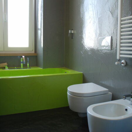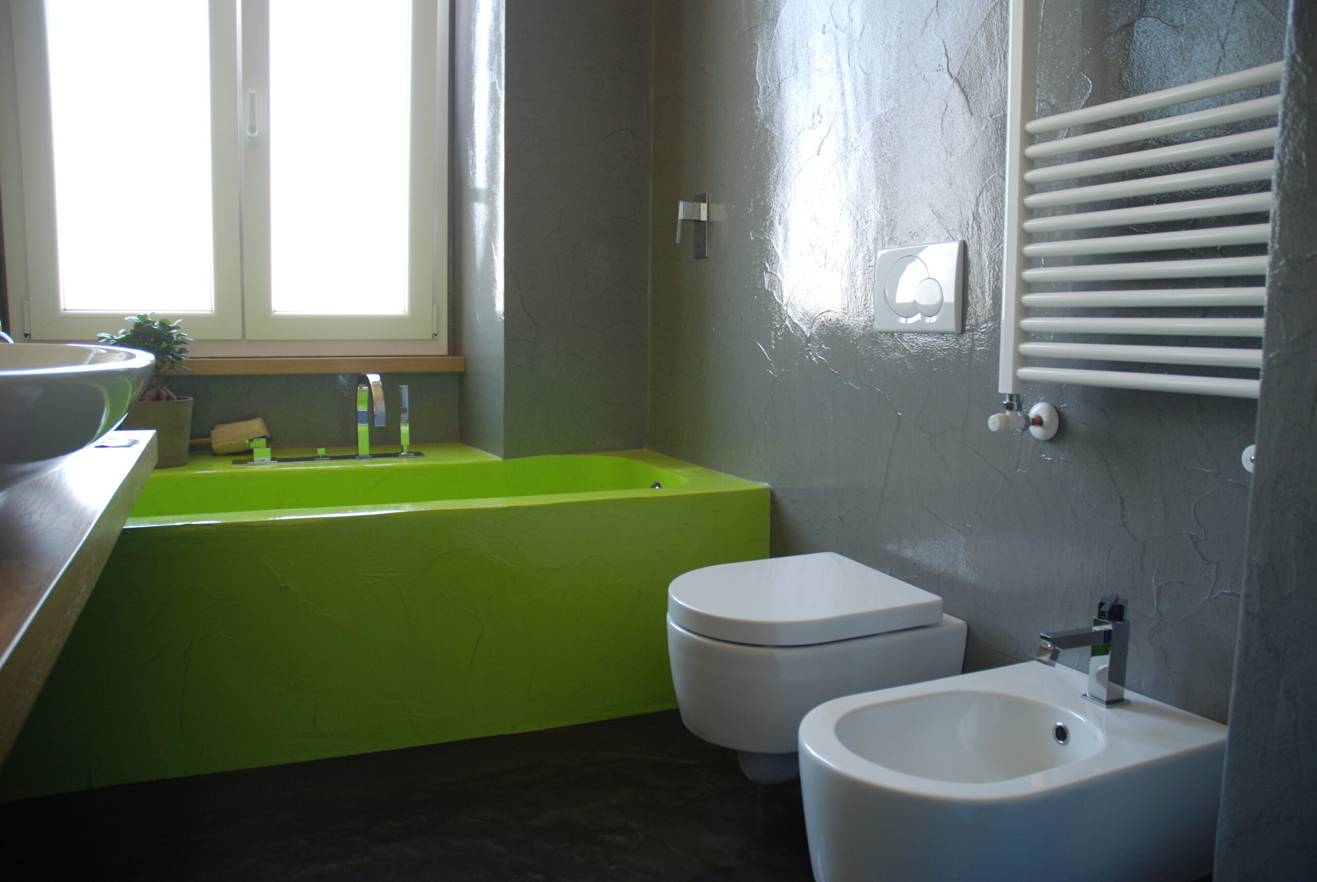 Il bagno con la vasca in muratura rivestita in resina color verde acido.