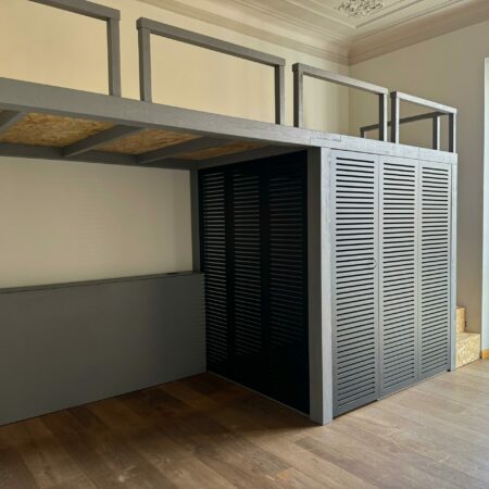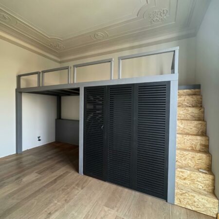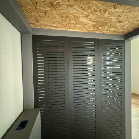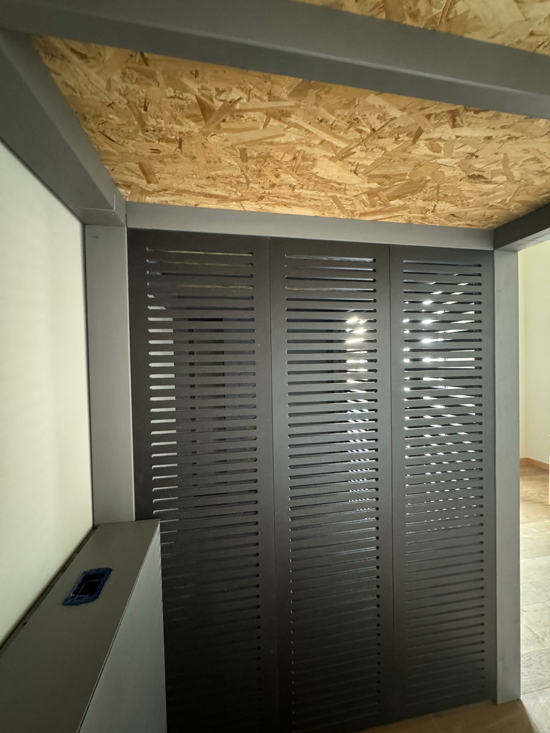 Due porte gemelle a tutta altezza conducono da una parte alla zona di servizio e dall’altra alla zona notte padronale.