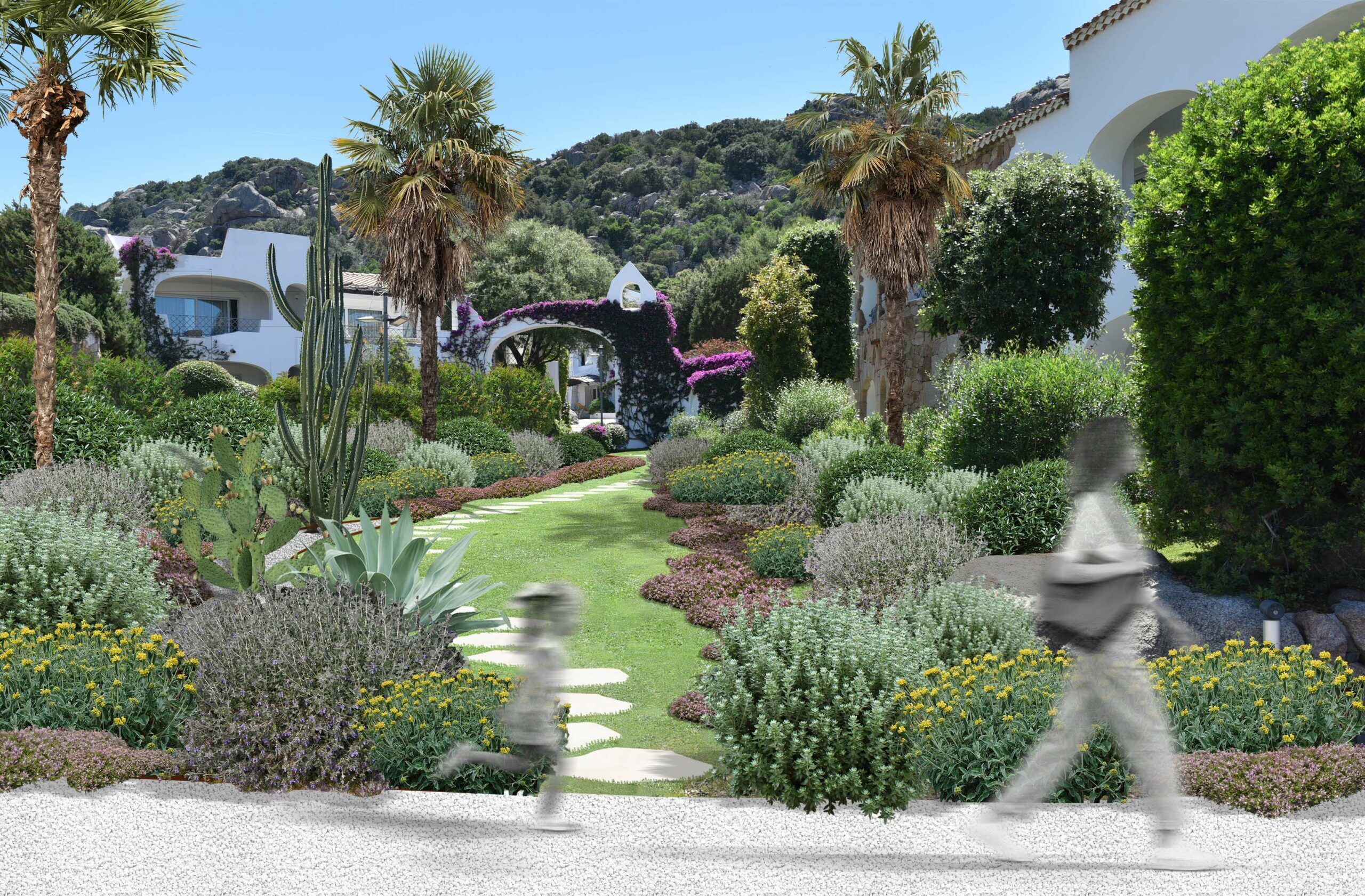 Gli ingredienti utilizzati sul parterre verso la reception sono i medesimi incontrati in precedenza: un percorso con i passi persi giganti, una selezione di vegetazione xerofita posizionata su un letto di ciottoli bianchi che proseguono le linee sinuose della pavimentazione, il contrasto con le pezzature di gariga e vegetazione della macchia mediterranea dai colori variegati e le succulente dal portamento scenografico