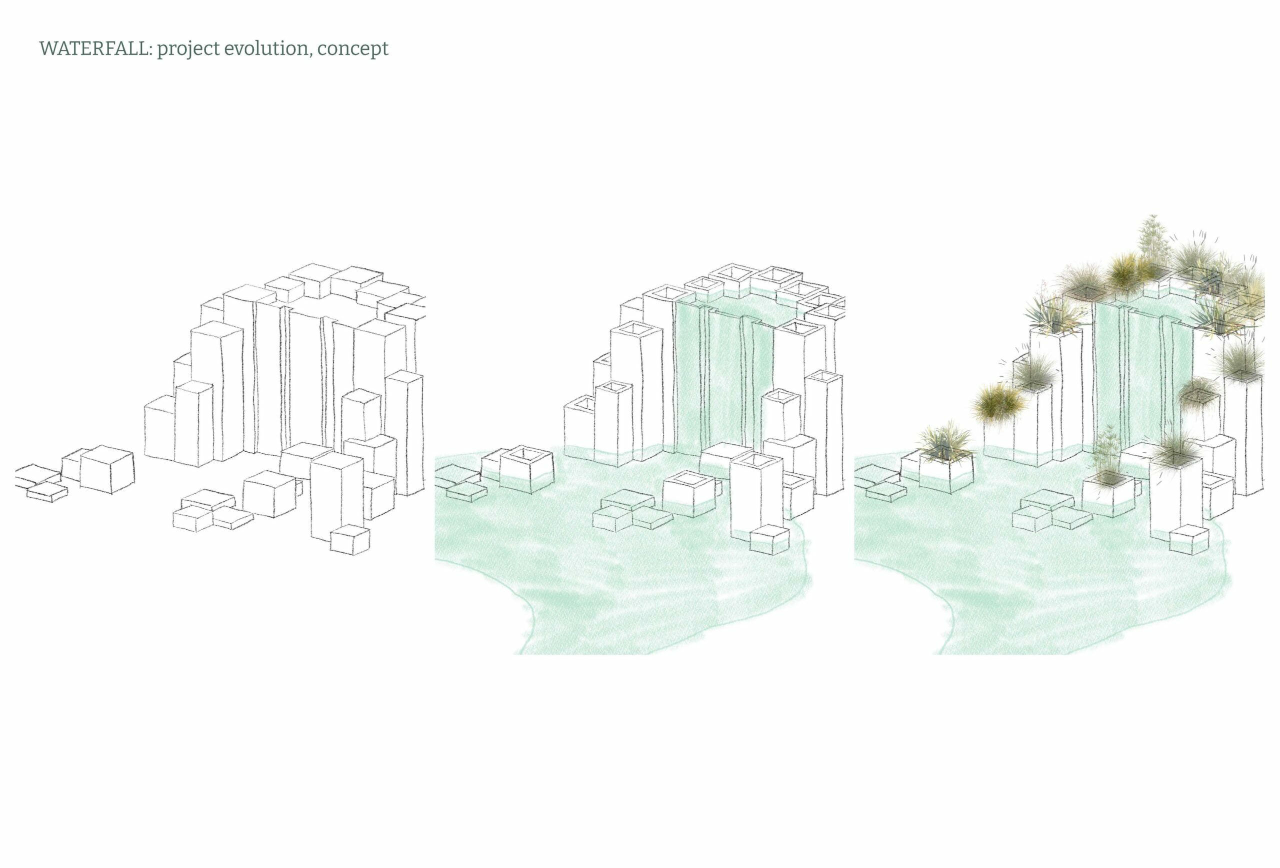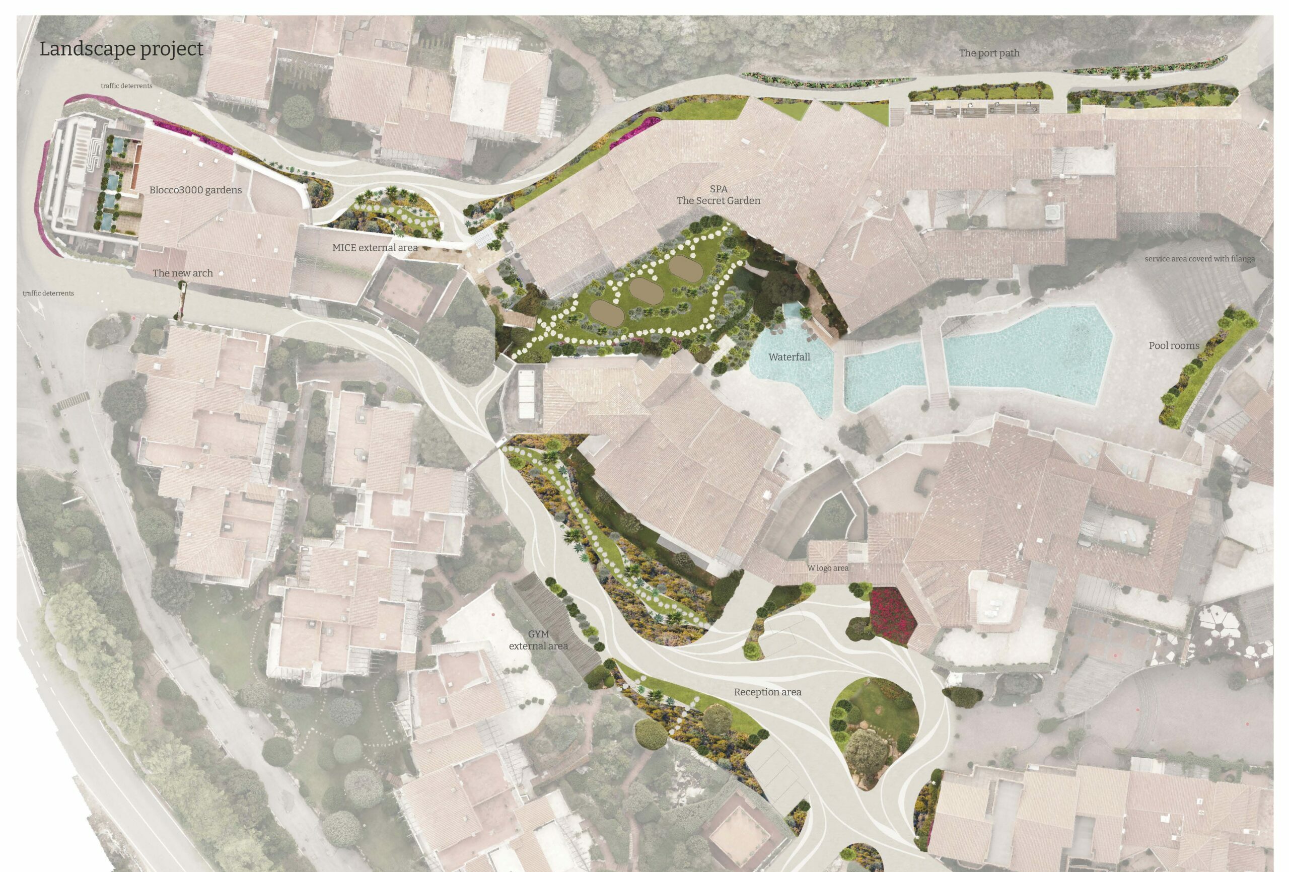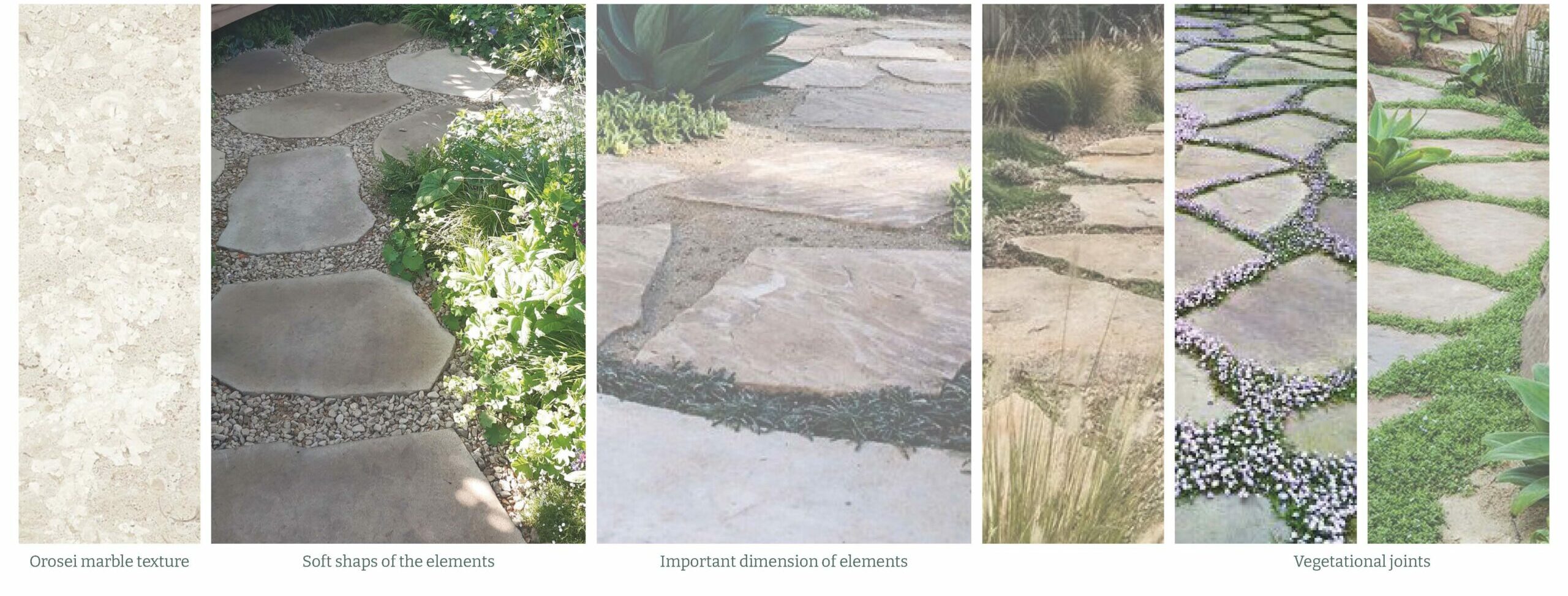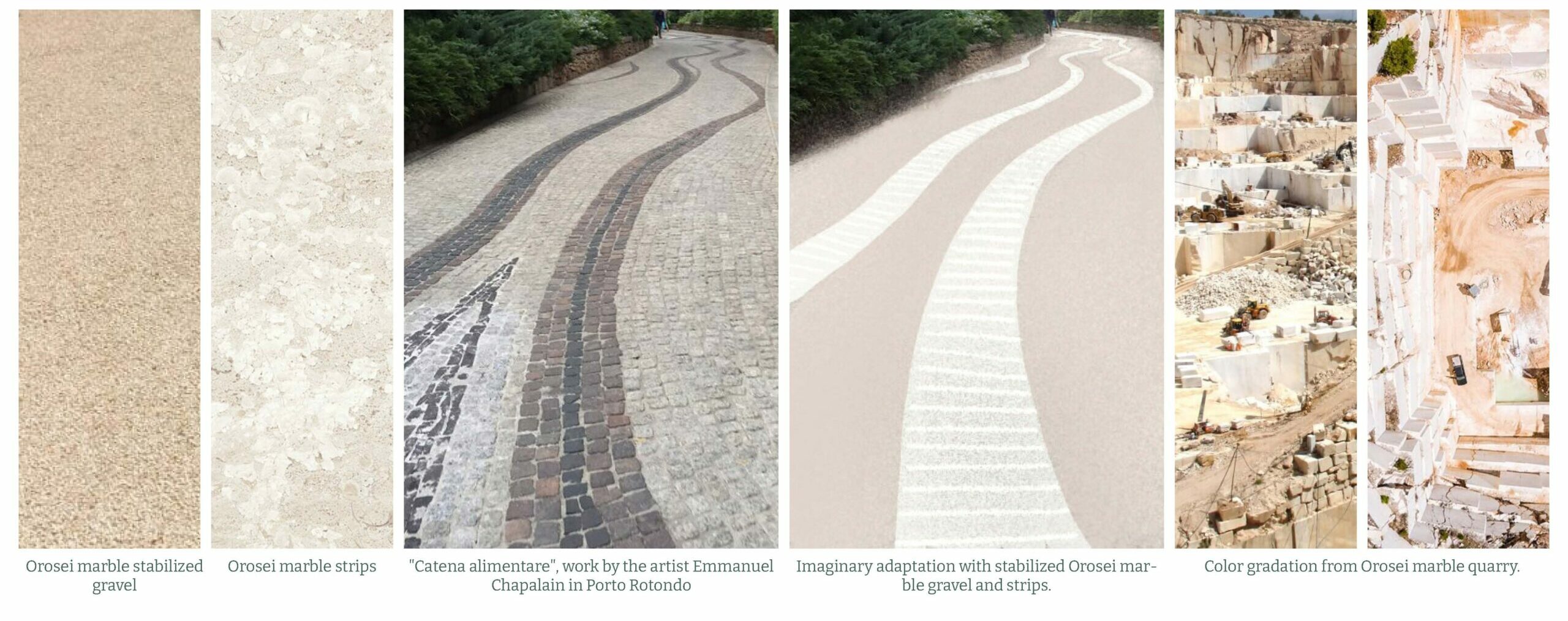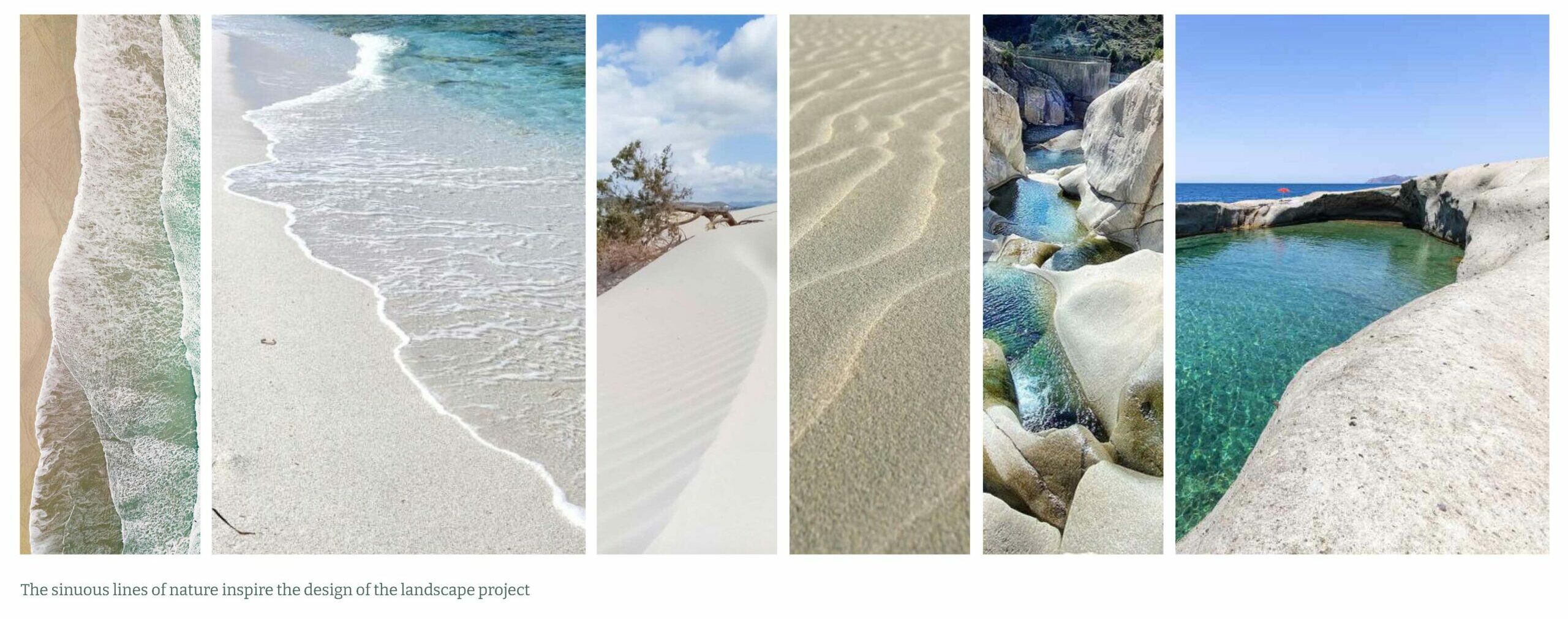 L’idea principale su cui si innesta il progetto del paesaggio è la ricerca di un filo unitario attraverso la proposta di una pavimentazione omogenea in ghiaino stabilizzato, fatto con lo sfrido del marmo bianco di Orosei. Codesto tappeto uniforme viene impreziosito da linee sinuose che fluiscono verso il mare, accompagnando il visitatore a trovare la strada. I listelli sottili affiancati uno all’altro creano pance sinuose che rievocano i disegni lasciati dalla risacca sulla sabbia.