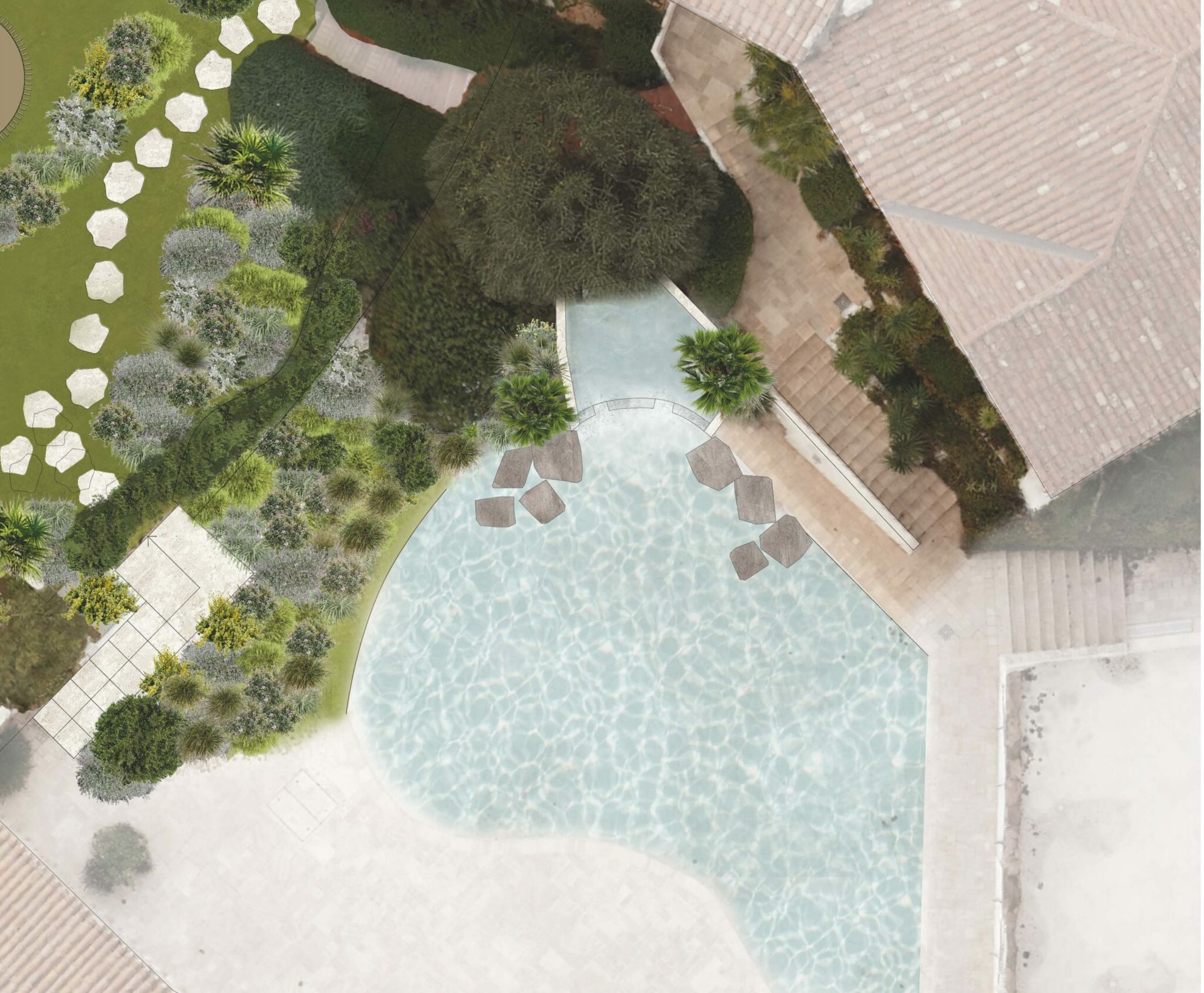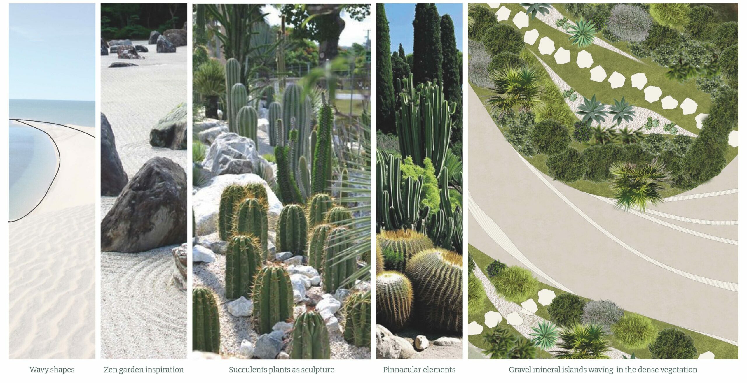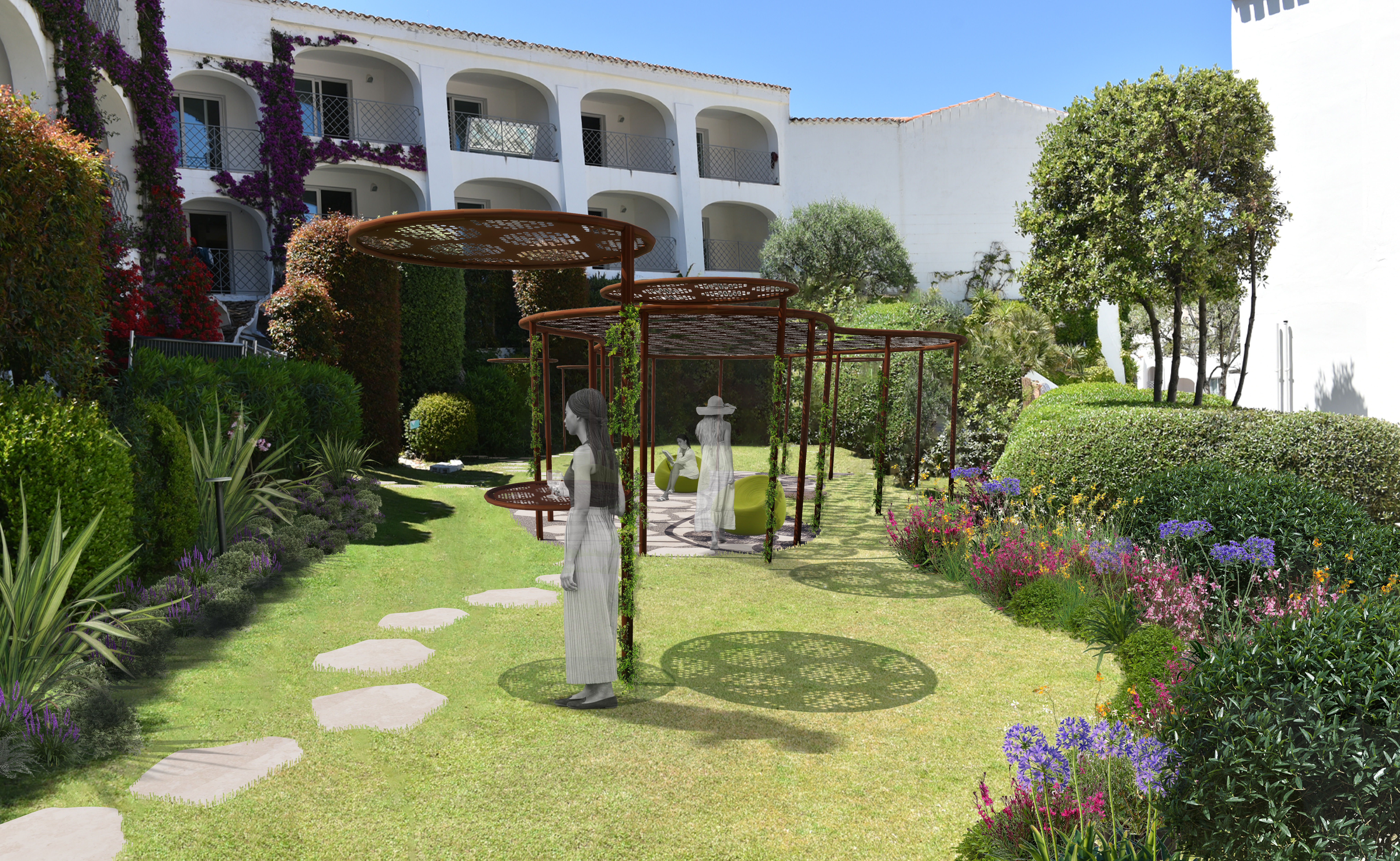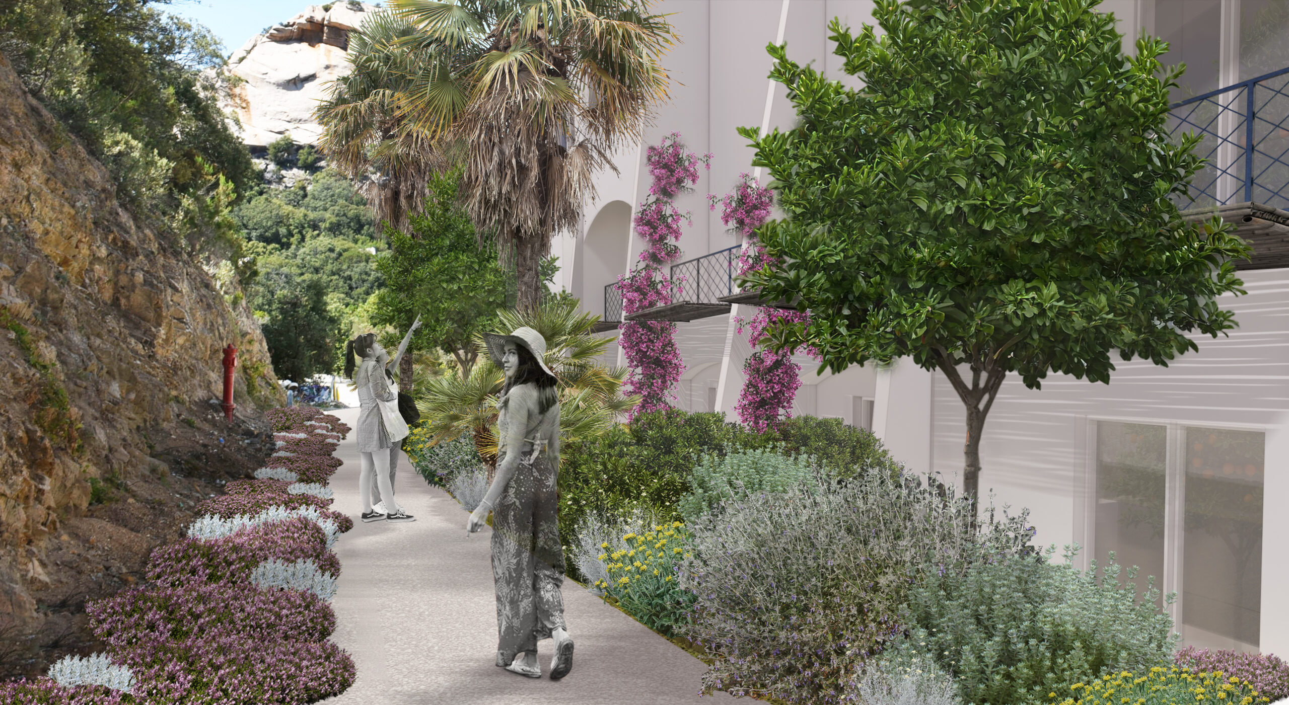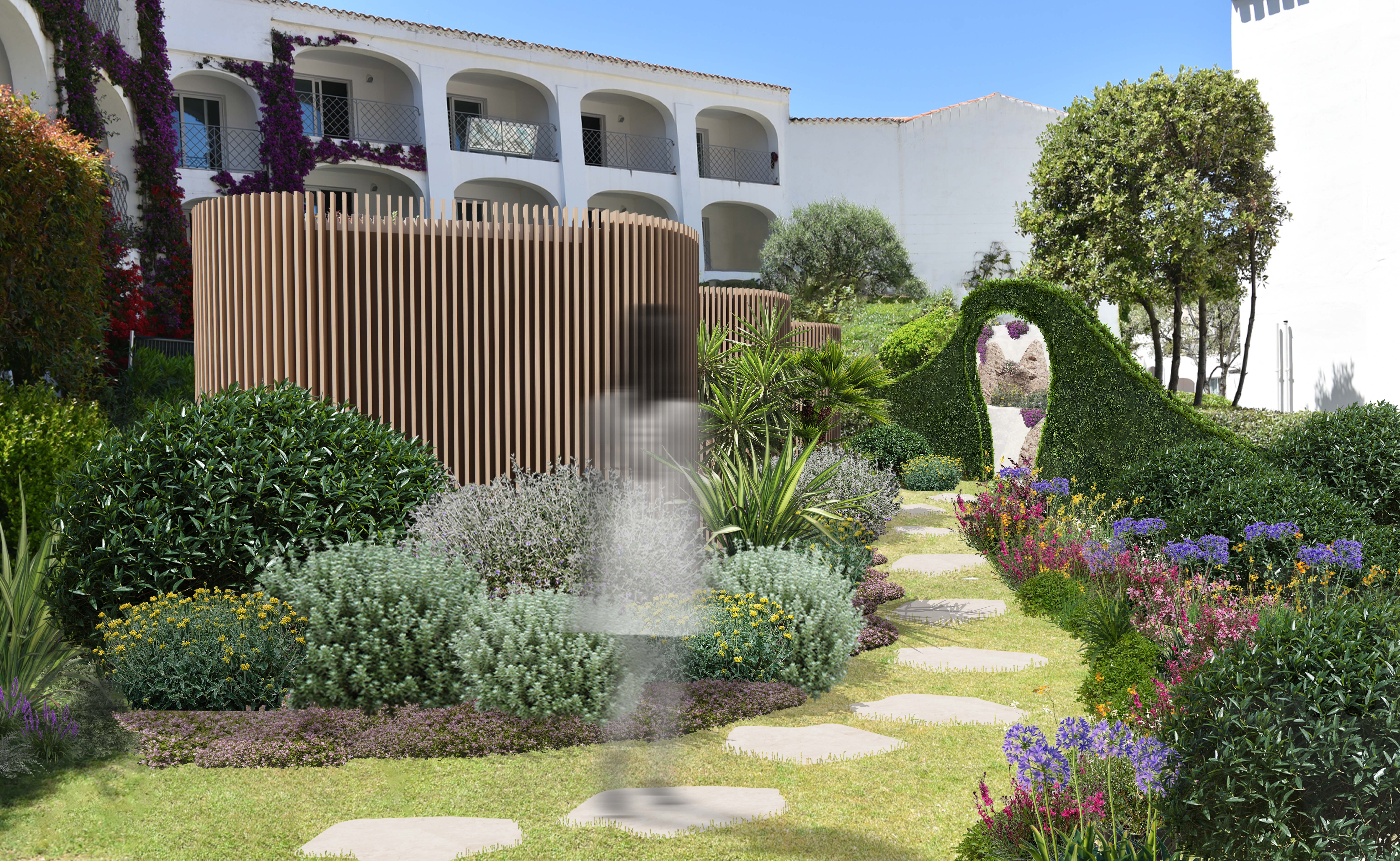 Gli ingredienti utilizzati sul parterre verso la reception sono i medesimi incontrati in precedenza: un percorso con i passi persi giganti, una selezione di vegetazione xerofita posizionata su un letto di ciottoli bianchi che proseguono le linee sinuose della pavimentazione, il contrasto con le pezzature di gariga e vegetazione della macchia mediterranea dai colori variegati e le succulente dal portamento scenografico
