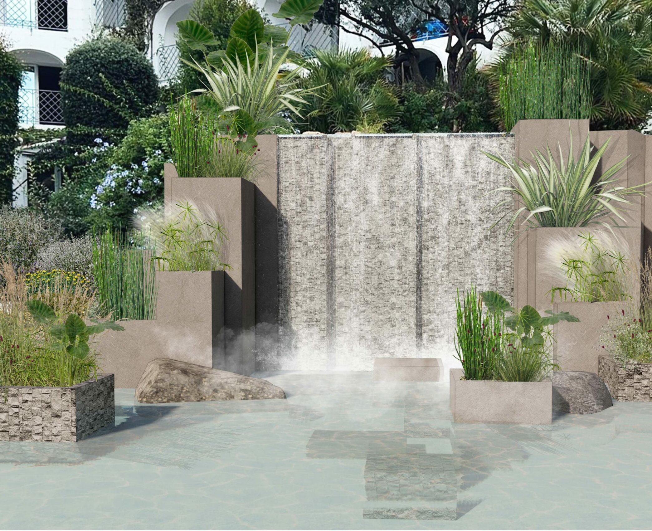 Nelle tasche di terra, tra i due ordini di roccaille, vengono inseriti prevalentemente specie xerofite quali Opuntia ficus indica e un rampicante sempreverde, il Ficus repens, che dovrebbe rinverdire l’intera parete.